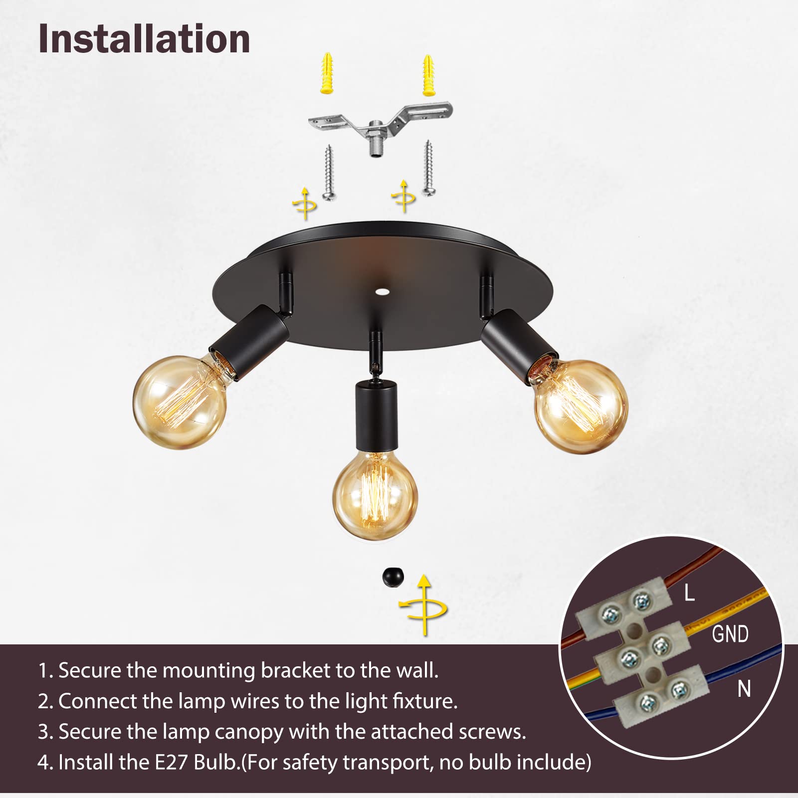 - 360° + 180° Rotatable Ceiling Spotlight: Three flexible E27 lamp heads can rotate to any angle, allowing you to adjust the light to your specific needs for both focused and dispersed lighting.