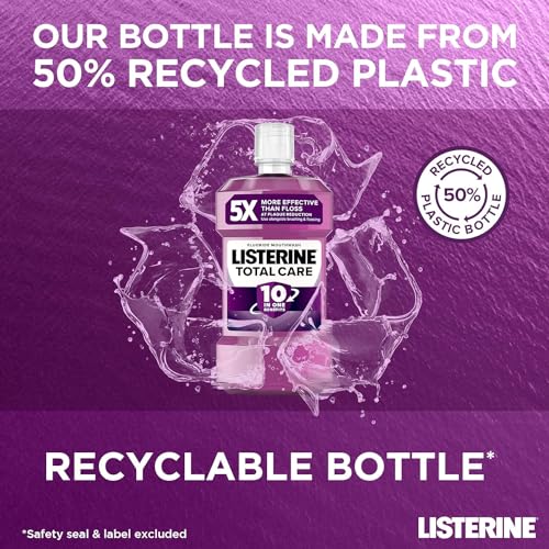 Listerine Total Care is the trusted choice for comprehensive oral care. Designed to kill up to 99% of plaque and bad breath-causing germs, it offers 12-hour germ protection and up to 24-hour fresh breath protection when used twice daily. With fluoride for enamel remineralization and zinc chloride to help prevent tartar, this mouthwash strengthens teeth, helps prevent cavities, and keeps your mouth feeling fresh and clean.