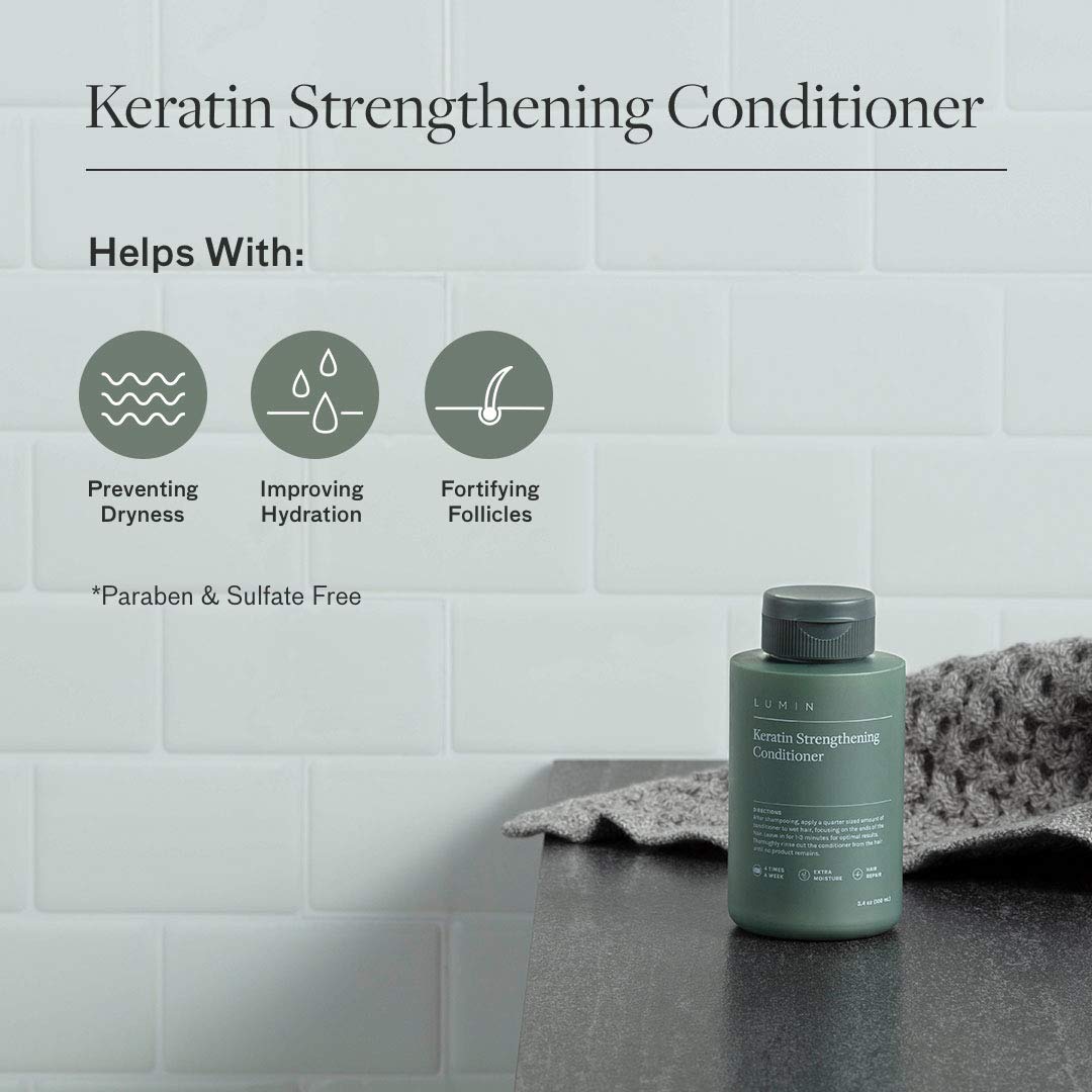 - Keratin Strengthening Conditioner: Jojoba oil and green tea leaf help repair damaged ends, fortify weakened follicles, and reduce the appearance of thinning.