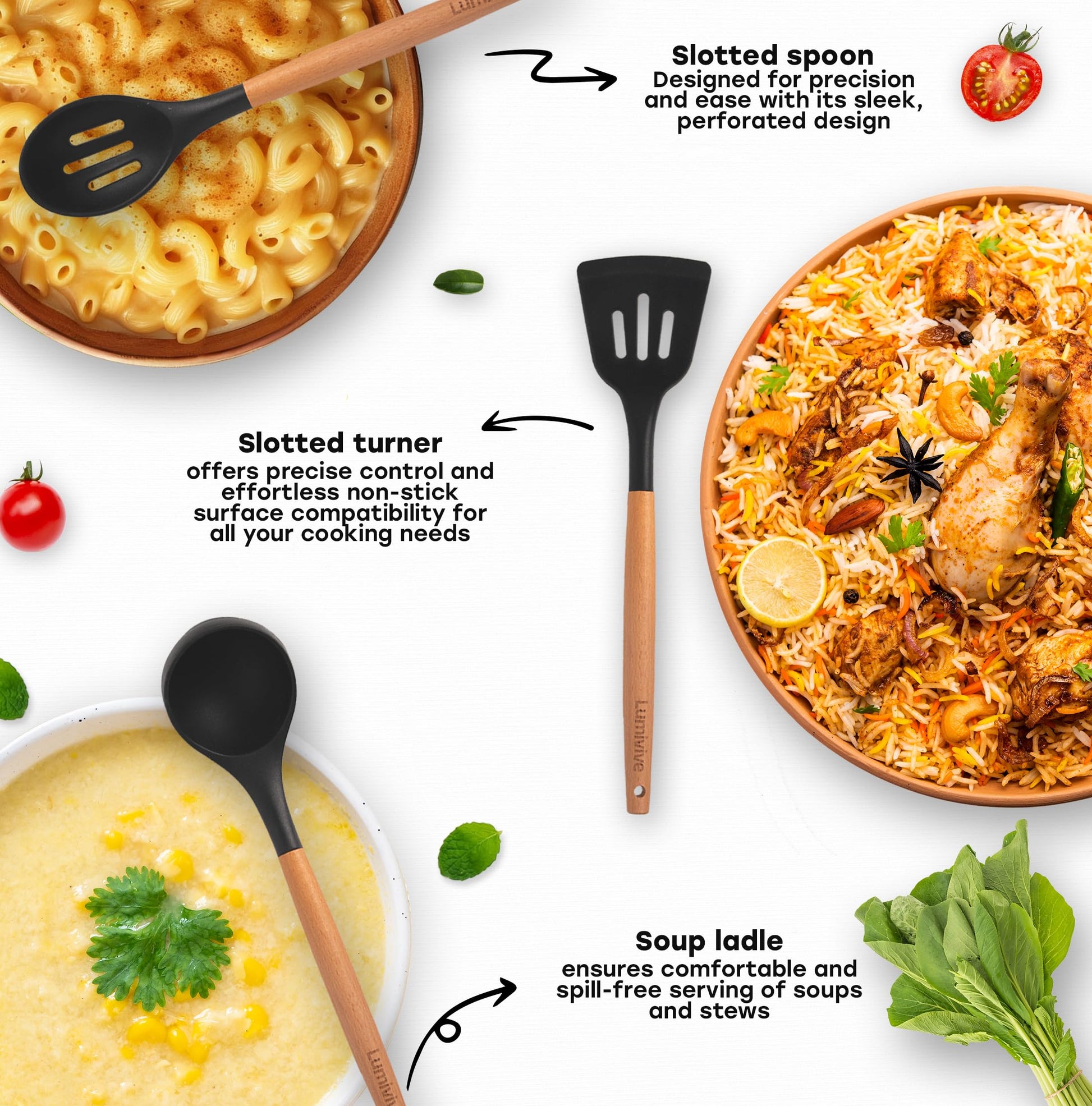 - Comprehensive Set: Includes a spreader spatula, egg whisk, basting brush, pasta server, ladle scoop, slotted turner, spoon, and more—ideal for non-stick pans.