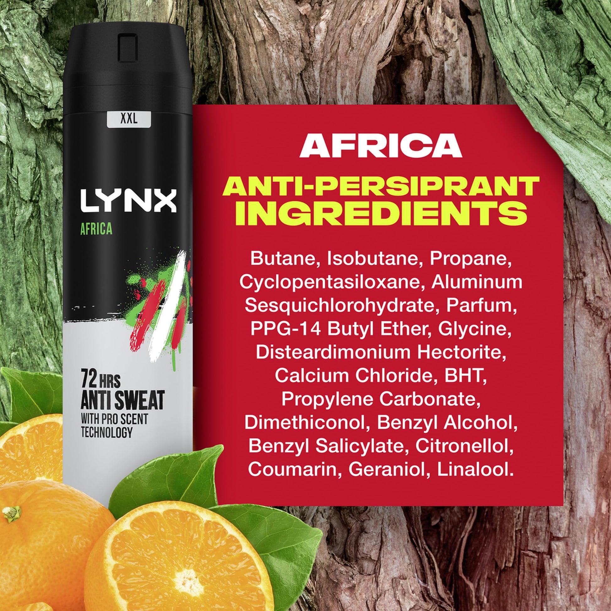 - Lynx XXL Africa Antiperspirant Deodorant Spray | 72-hour protection -