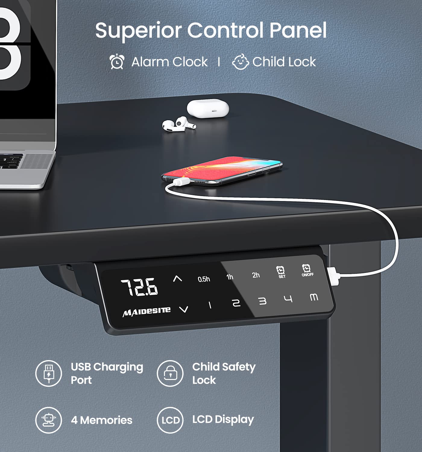 - Multi-function Control Panel: Includes 4 memory keys for quick height adjustments, a sit-stand reminder to promote a healthier lifestyle, USB ports for device charging, and a child safety lock for added security.