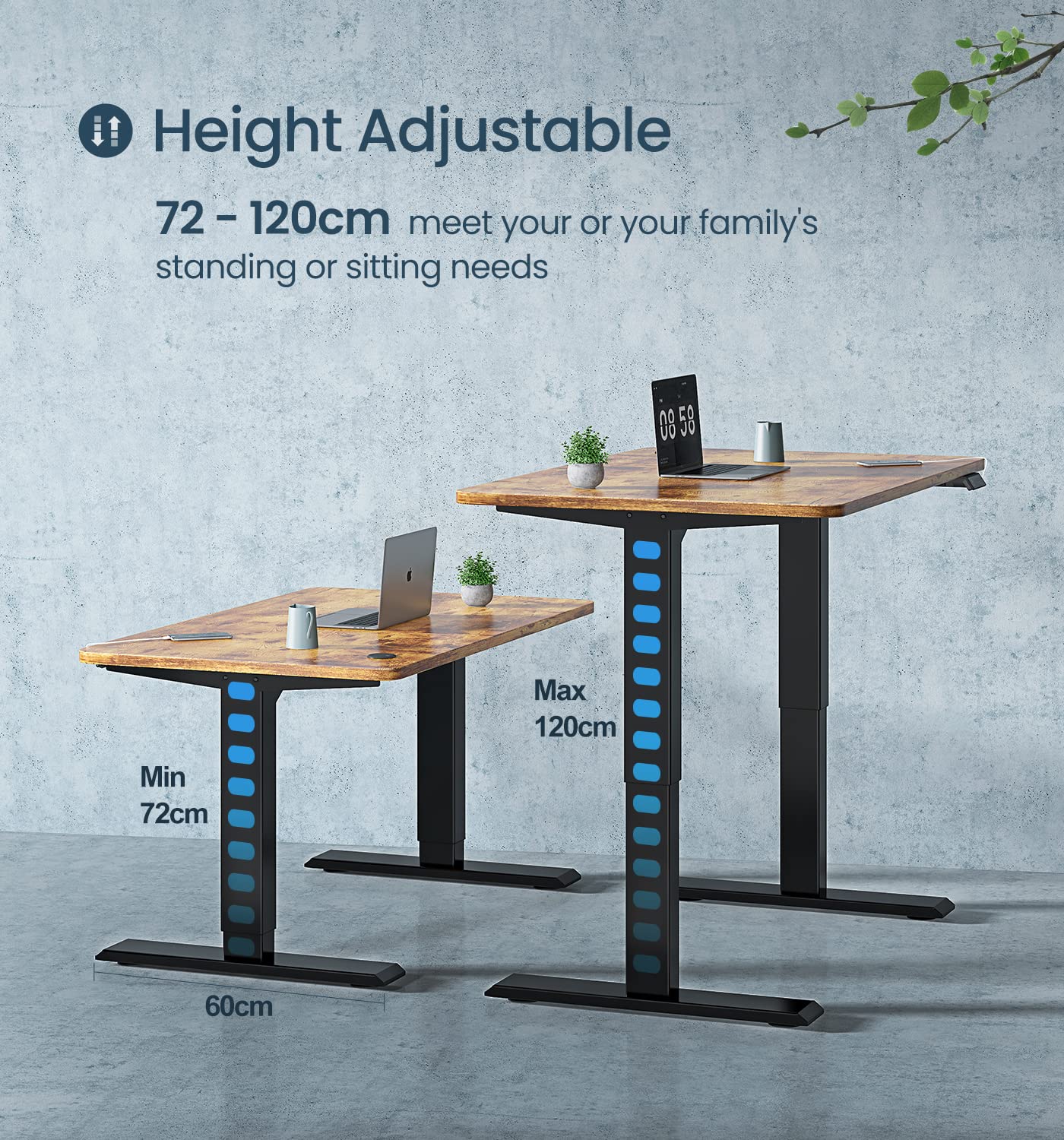 - Large Adjustment Range: The -2stage standing desk frame offers a height adjustment range of 72-120 cm, easily accommodating individuals of varying heights. The frame width extends between 100-180 cm, fitting desktops between 100-220 cm in width.