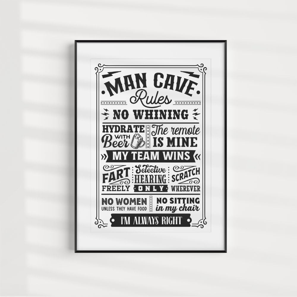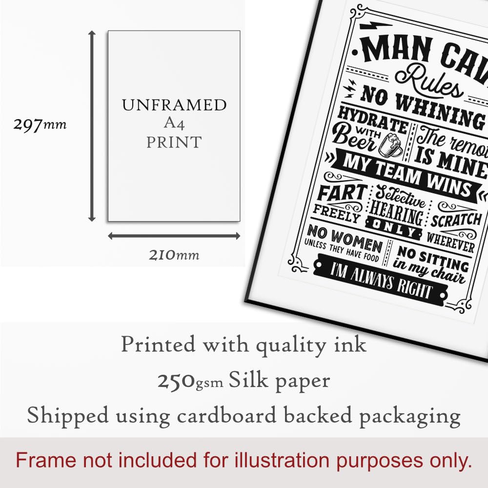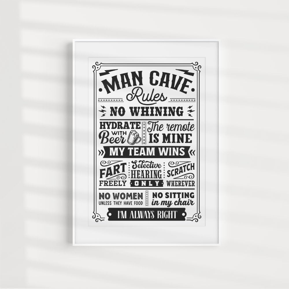 - Maise & Rose Man Cave Gift | Funny Man Cave Rules A4 Unframed Black and White Print | Man Cave Wall Art -