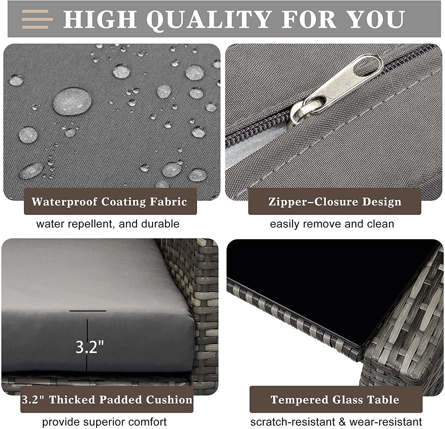 - Package Includes: 2x one-seater chairs, 1x two-seater chair, 1x table with tempered glass top