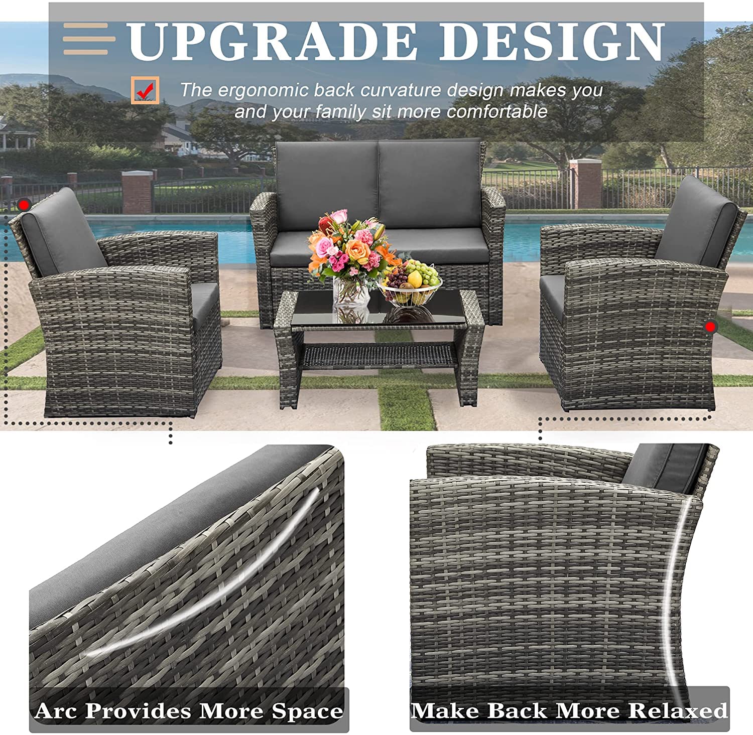 - Comfortable Seating: The curved armrests and cushioned seats provide added comfort, allowing you to fully relax in your garden or patio.