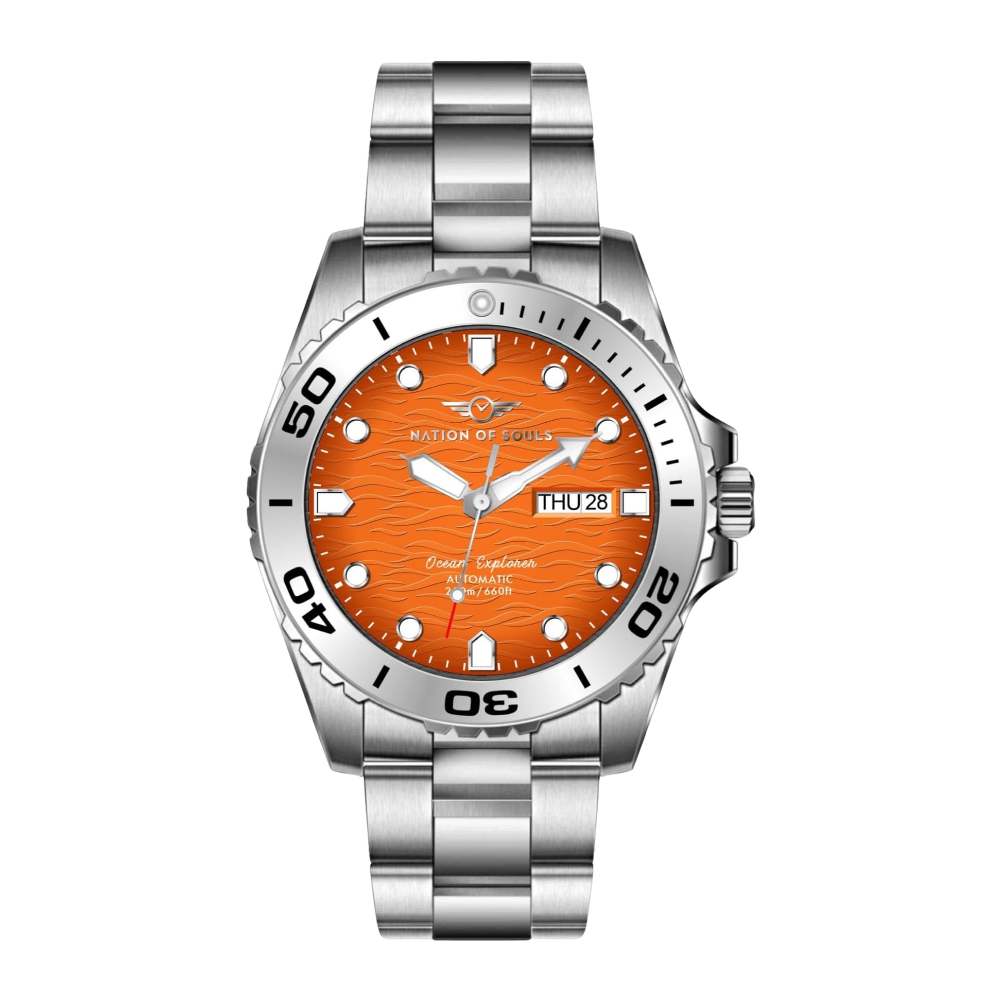 - Nation of Souls Silver and Orange Ocean Explorer | Men's Automatic Analogue Watch -