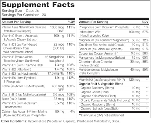 - Natural Vitamins & Minerals: Contains natural vitamins A, B complex, C, D3, E, K2, along with essential minerals like calcium, magnesium, zinc, selenium, and potassium, sourced from organic ingredients.