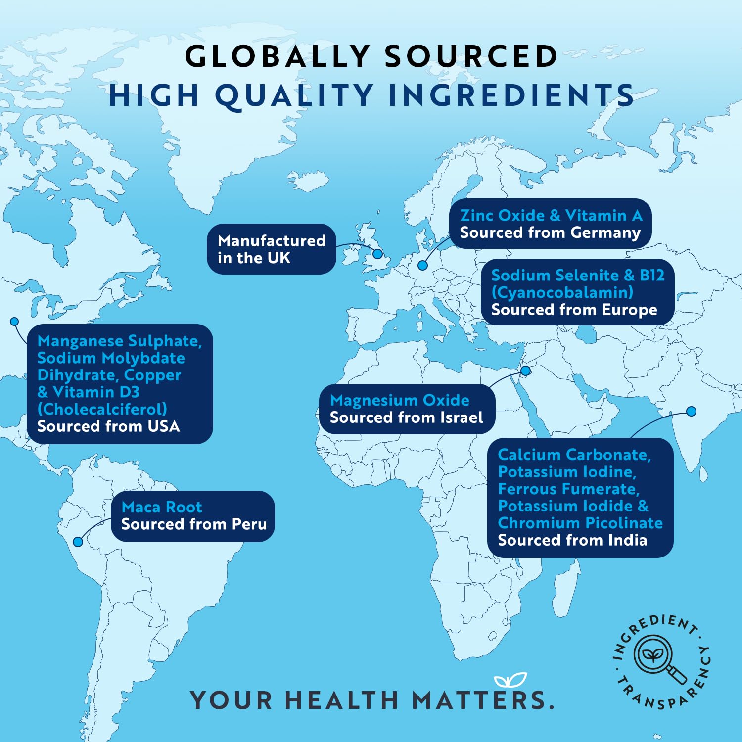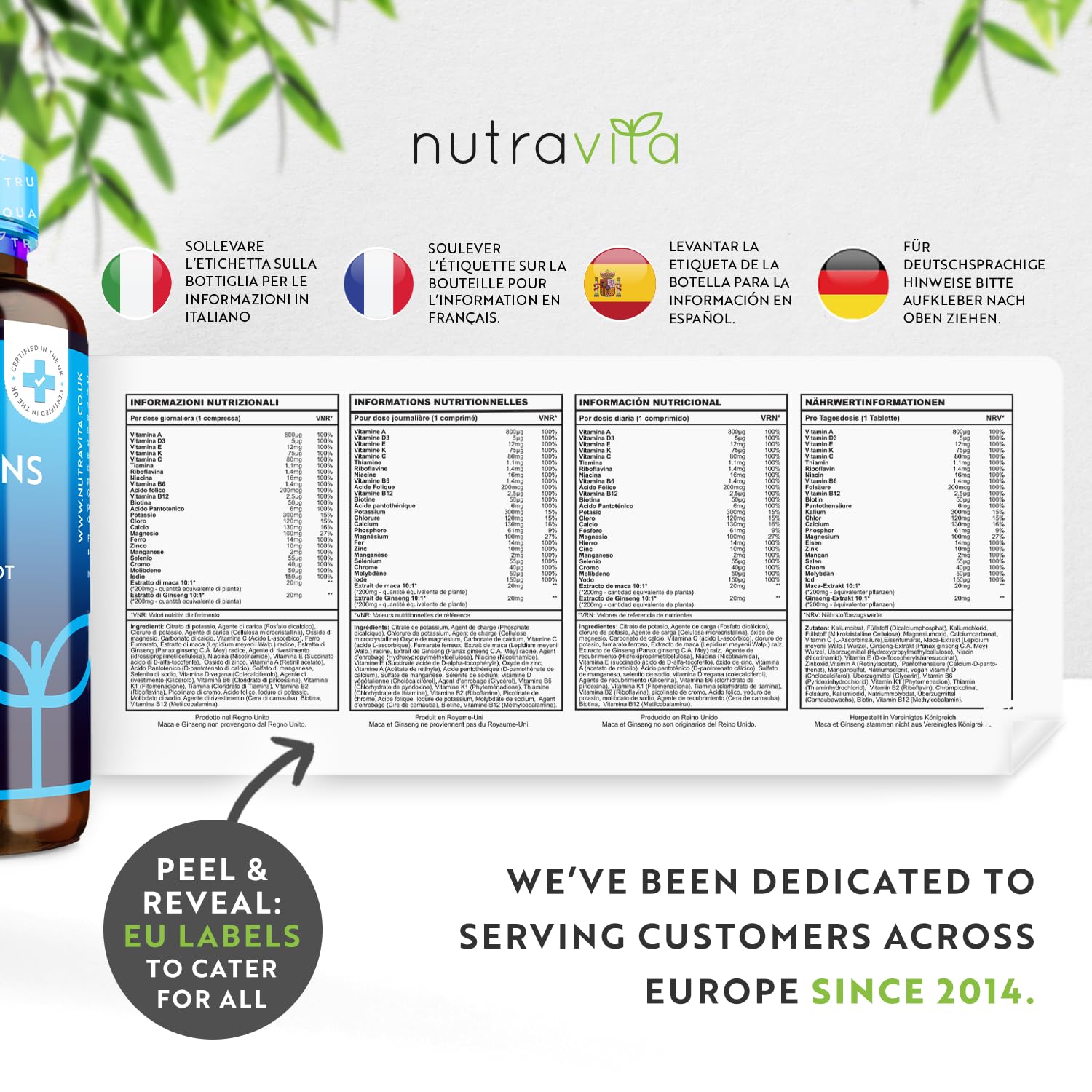 - Ingredients: Vitamin A, Vitamin D3, Vitamin C, Vitamin B12, Maca Root Extract, Panax Ginseng, and more.