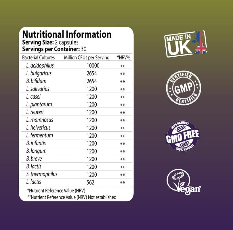 - 16 Live Strains – Includes Lactobacillus and Bifidobacterium strains, scientifically proven to survive stomach acid and reach the gut.