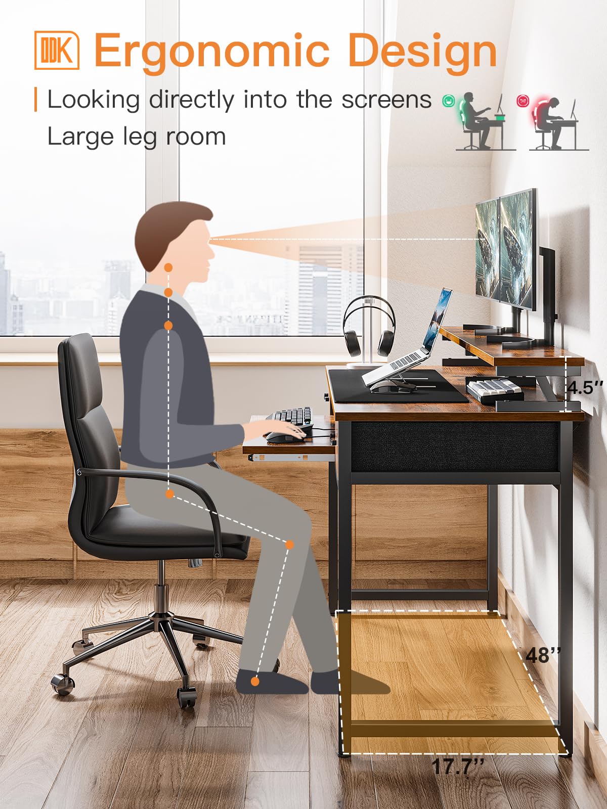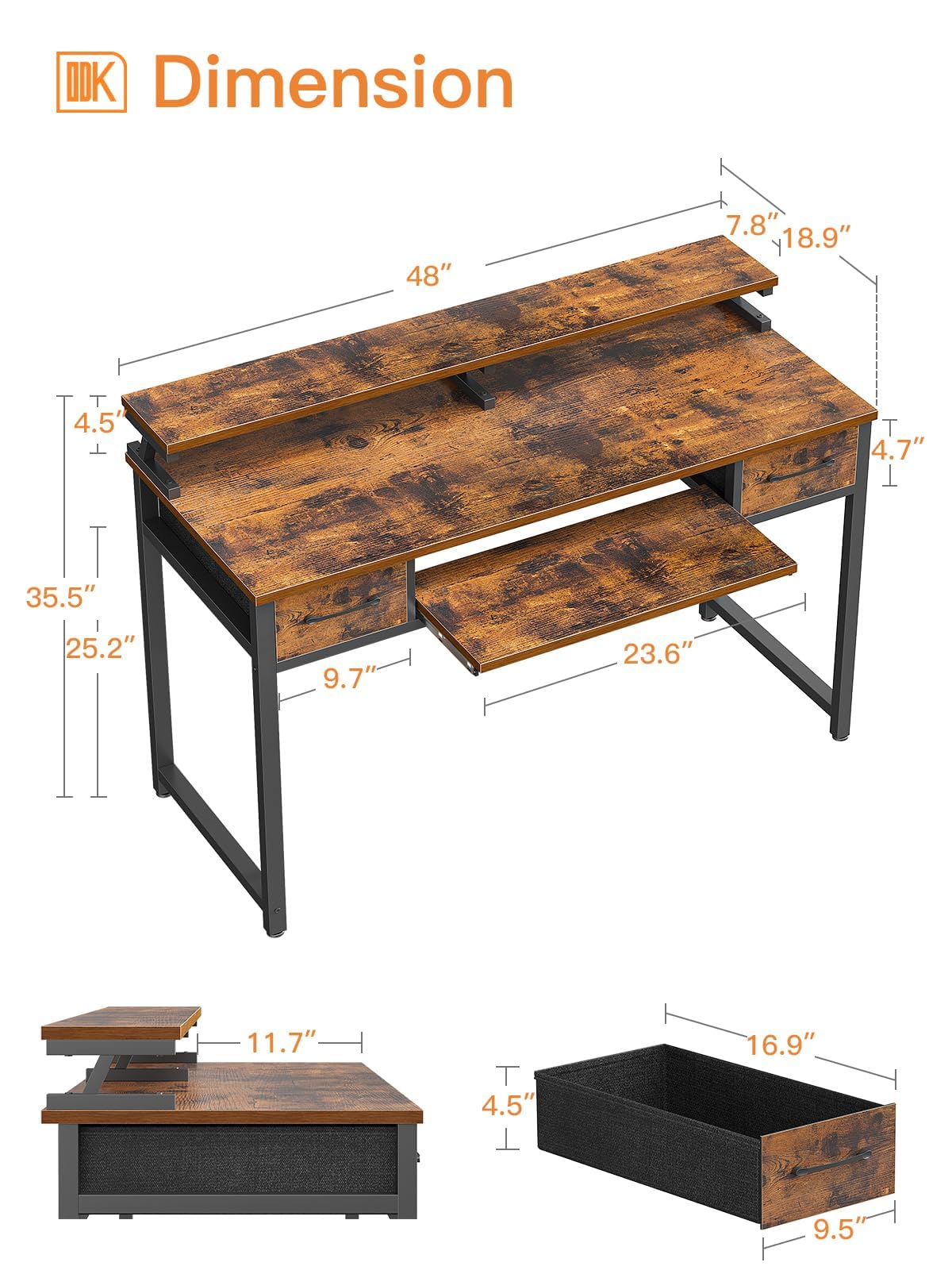 - Spacious Dimensions: The desk measures 48" L x 18.9" W x 35.5" H (including the height of the monitor shelf). The keyboard tray is 23.6" W x 11" D and pulls out 7.9" for easy access to your keyboard and mouse.