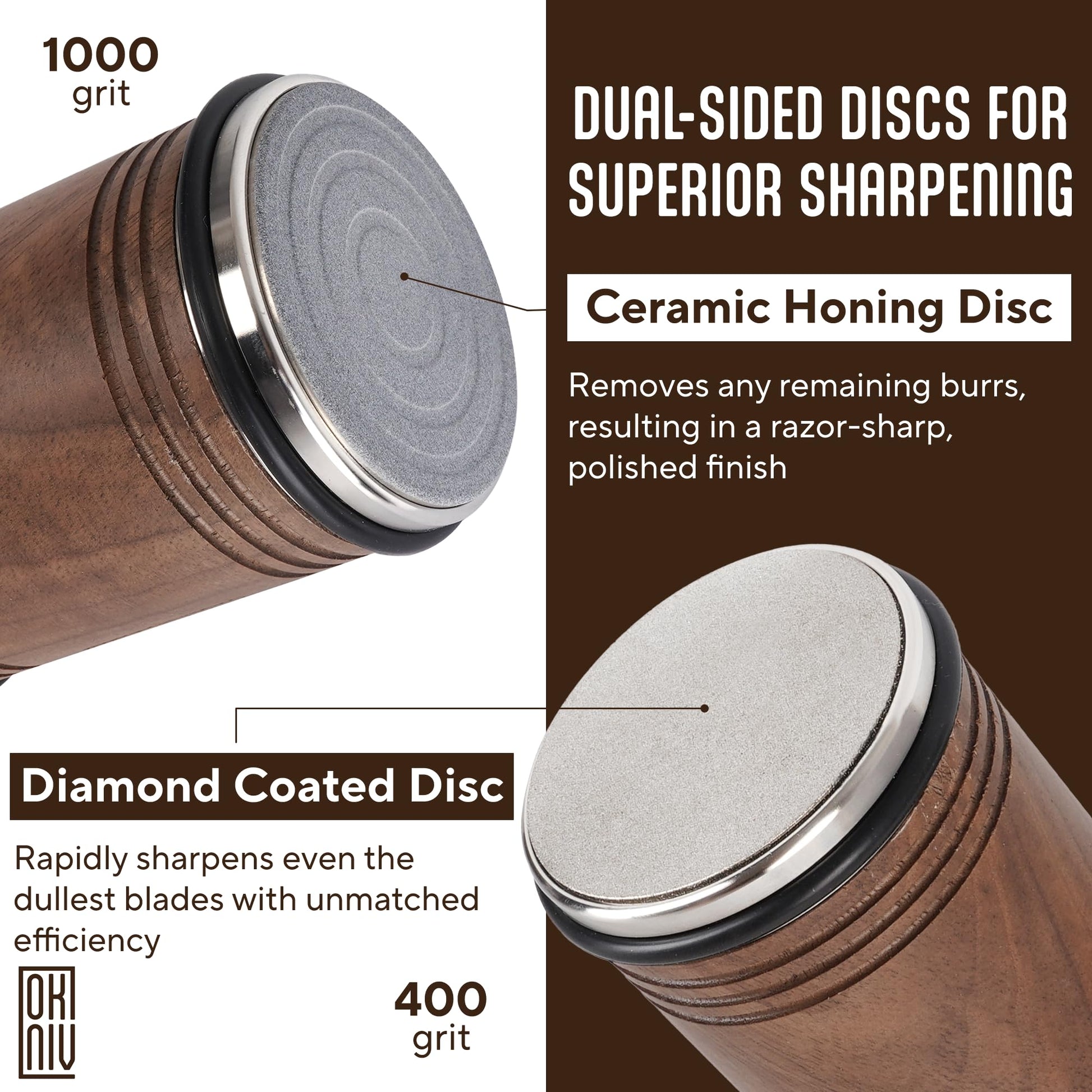 - Made to Last – Constructed with premium, durable materials, this sharpener features a wooden body with dual-sided diamond-coated discs and ceramic honing for razor-sharp precision that lasts.