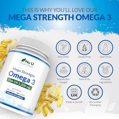 Elevate your health with Nu U Nutrition's Mega Strength Omega 3 supplement. This powerhouse formula delivers more than double the strength of typical omega 3 supplements, providing 2200mg of premium fish oil per serving, along with 2000IU of Vitamin D3. With 720mg of EPA and 480mg of DHA, this supplement is designed to support heart health, brain function, and vision. The purified fish oil undergoes a thorough refining process to ensure purity and freshness, offering a high-quality supplement that’s easy to swallow and gentle on the stomach.