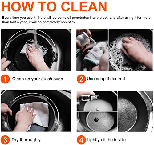 - Easy Care: After cooking, simply clean the Dutch oven, dry it completely, and lightly oil it to maintain its seasoning. This cookware is easy to maintain and built to last for decades.