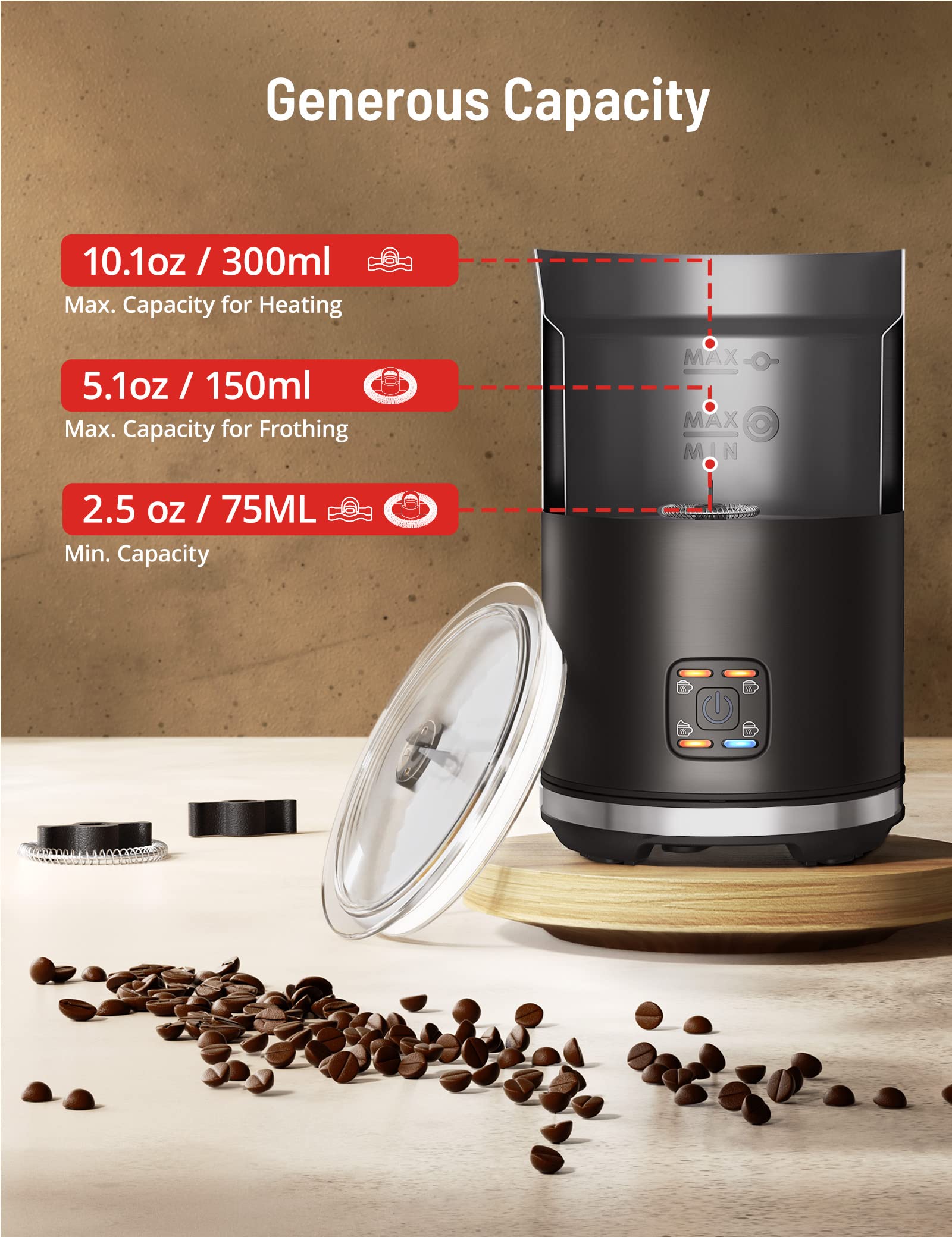 - Frothing Capacity: 75ml - 150ml (2.5 oz - 5.1 oz)