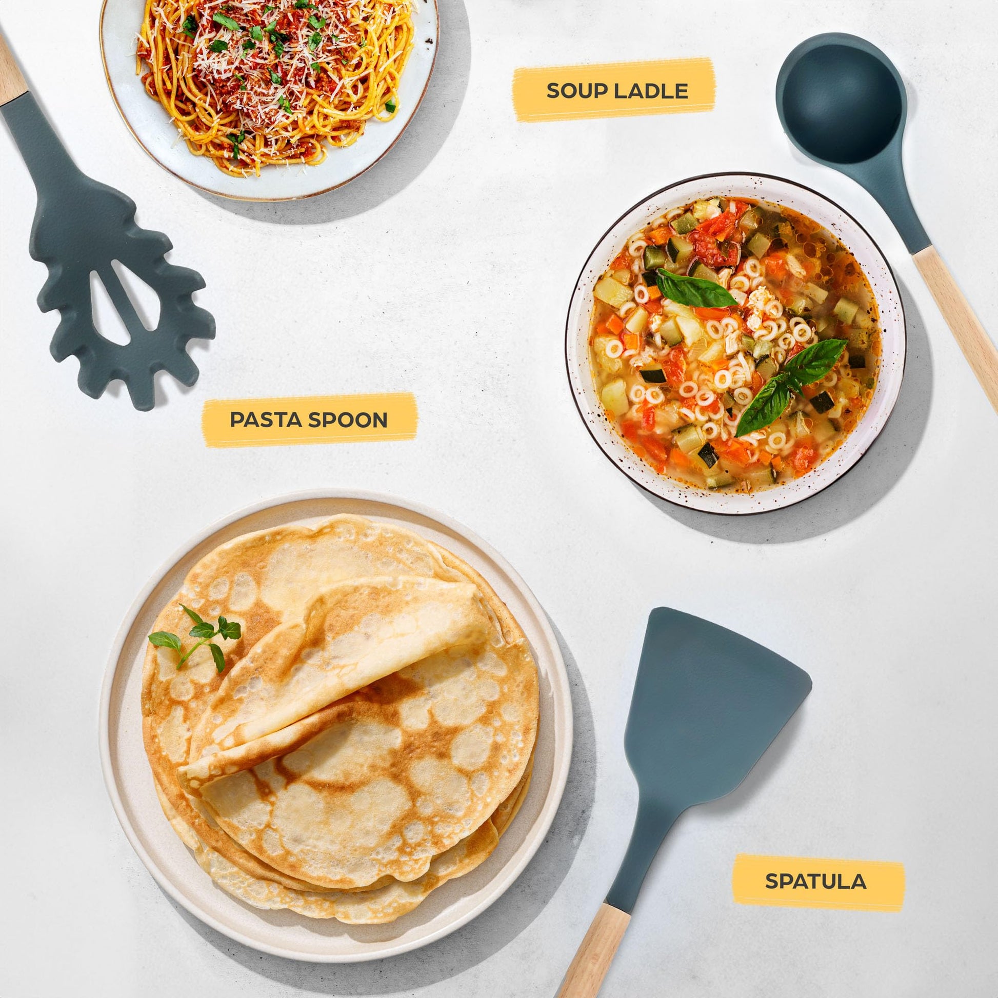 - Complete 8-Piece Set: This set includes all the essential kitchen utensils you need: a skimming ladle, tong, whisk, scraper, spatula, pasta spoon, ladle, and serving spoon.