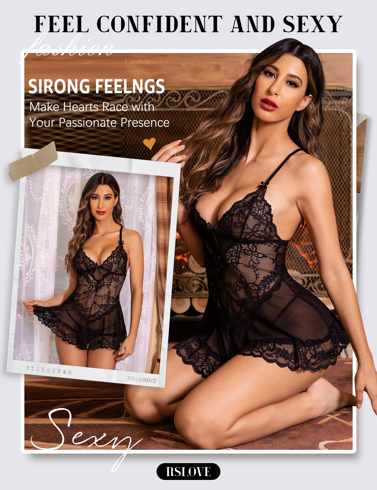 - RSLOVE | Womens Sexy Lingerie Lace Babydoll Mesh Chemise Sleepwear Bridal Nightdress | Black -