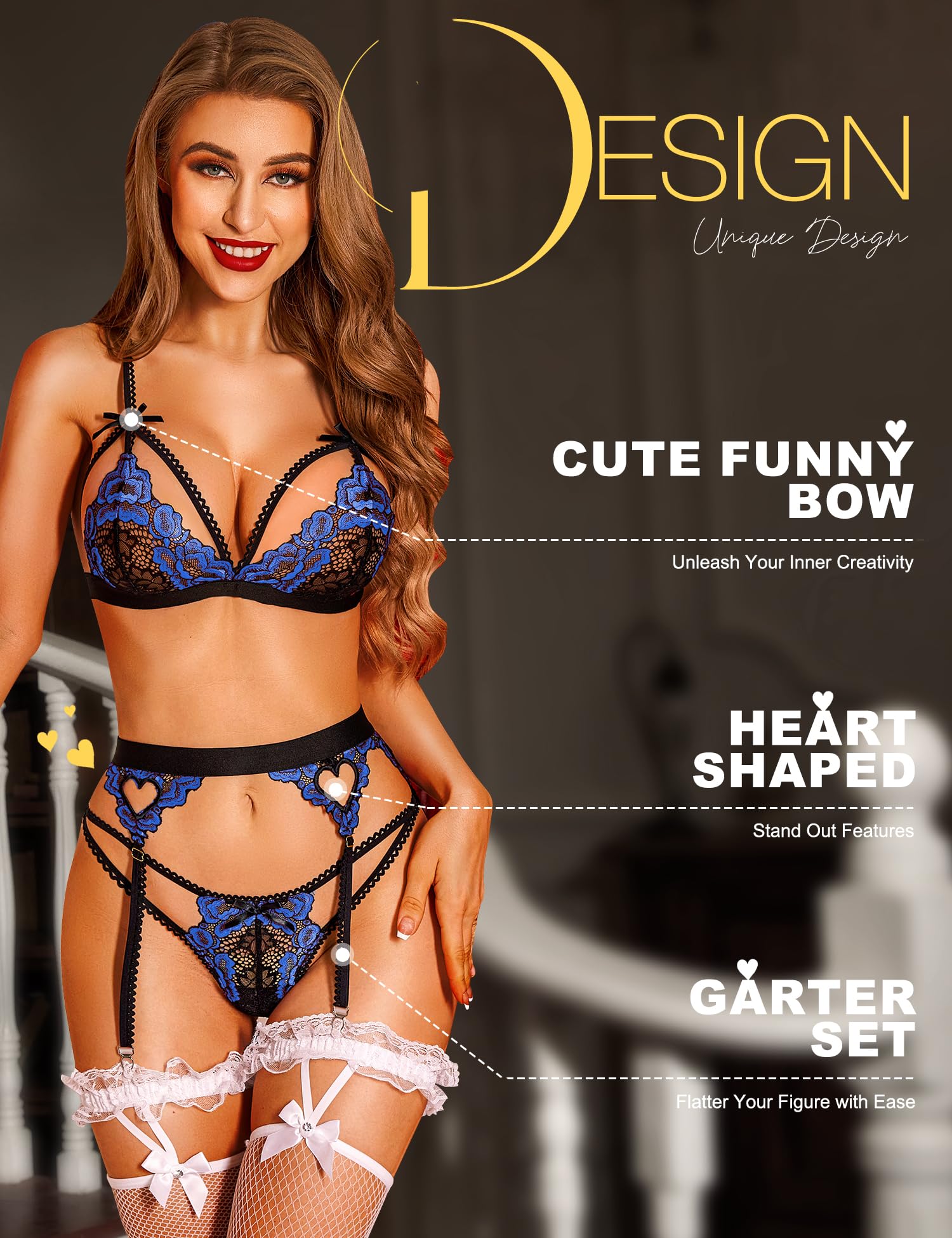 - Complete Three-Piece Set – Includes a matching bra, panty, and lace garter belt for a coordinated look.