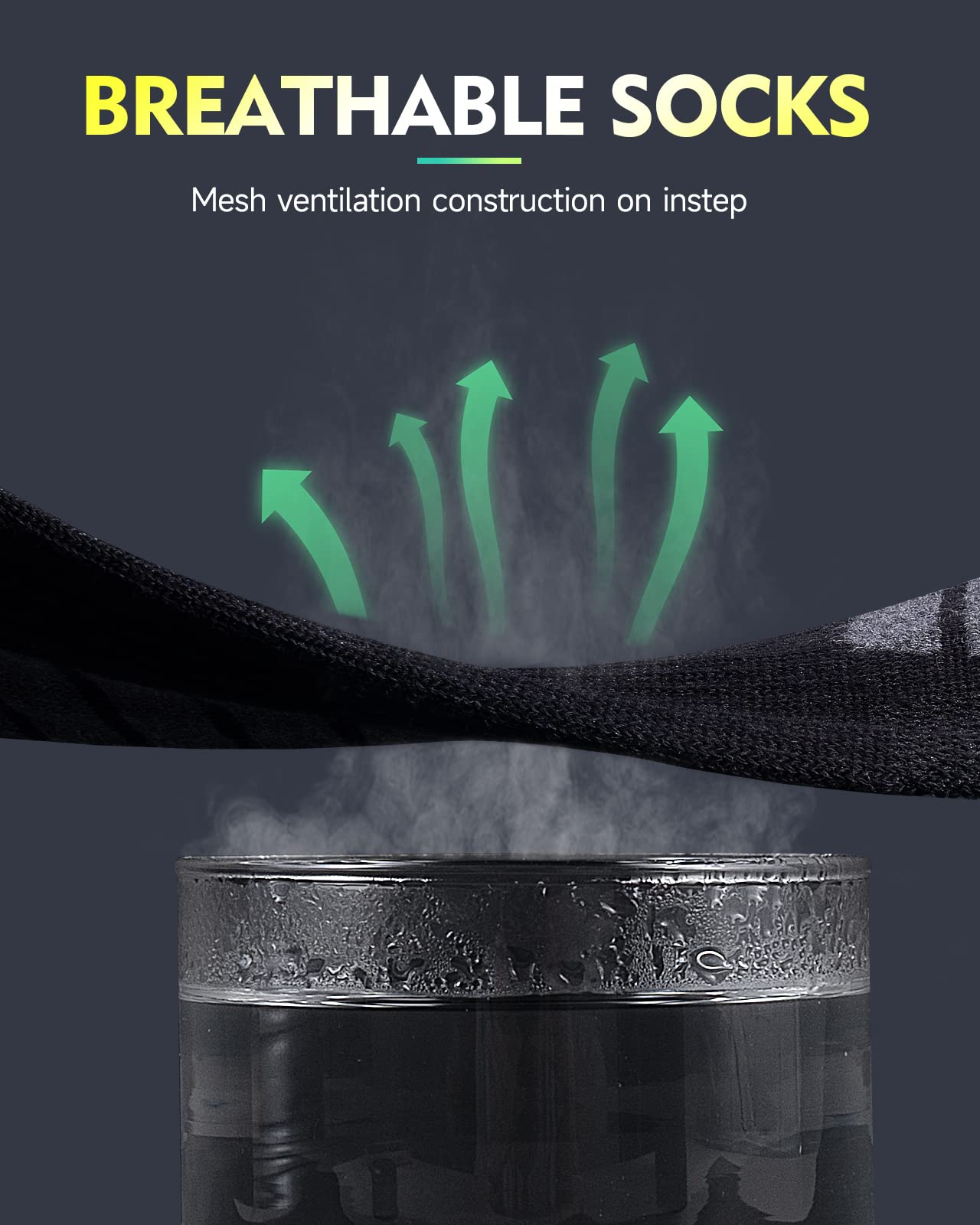 - Anti-Slip Design: Featuring an anti-slip strip and elastic cuff tab, these socks stay in place during physical activity, preventing discomfort and reducing friction, making them ideal for long runs or hikes.