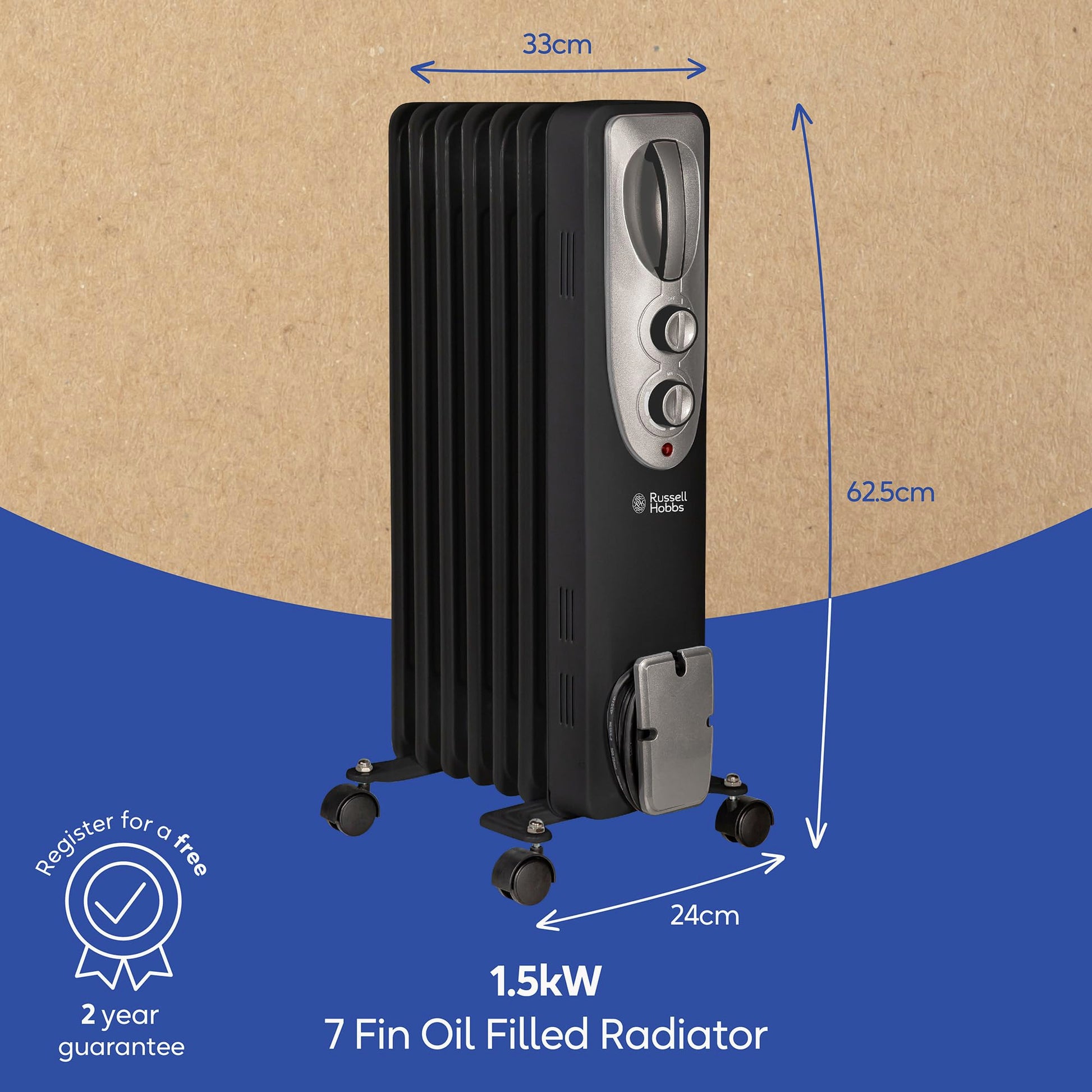 - Russell Hobbs 1500W/1.5KW Oil Filled Radiator | 7 Fin Portable Electric Heater -