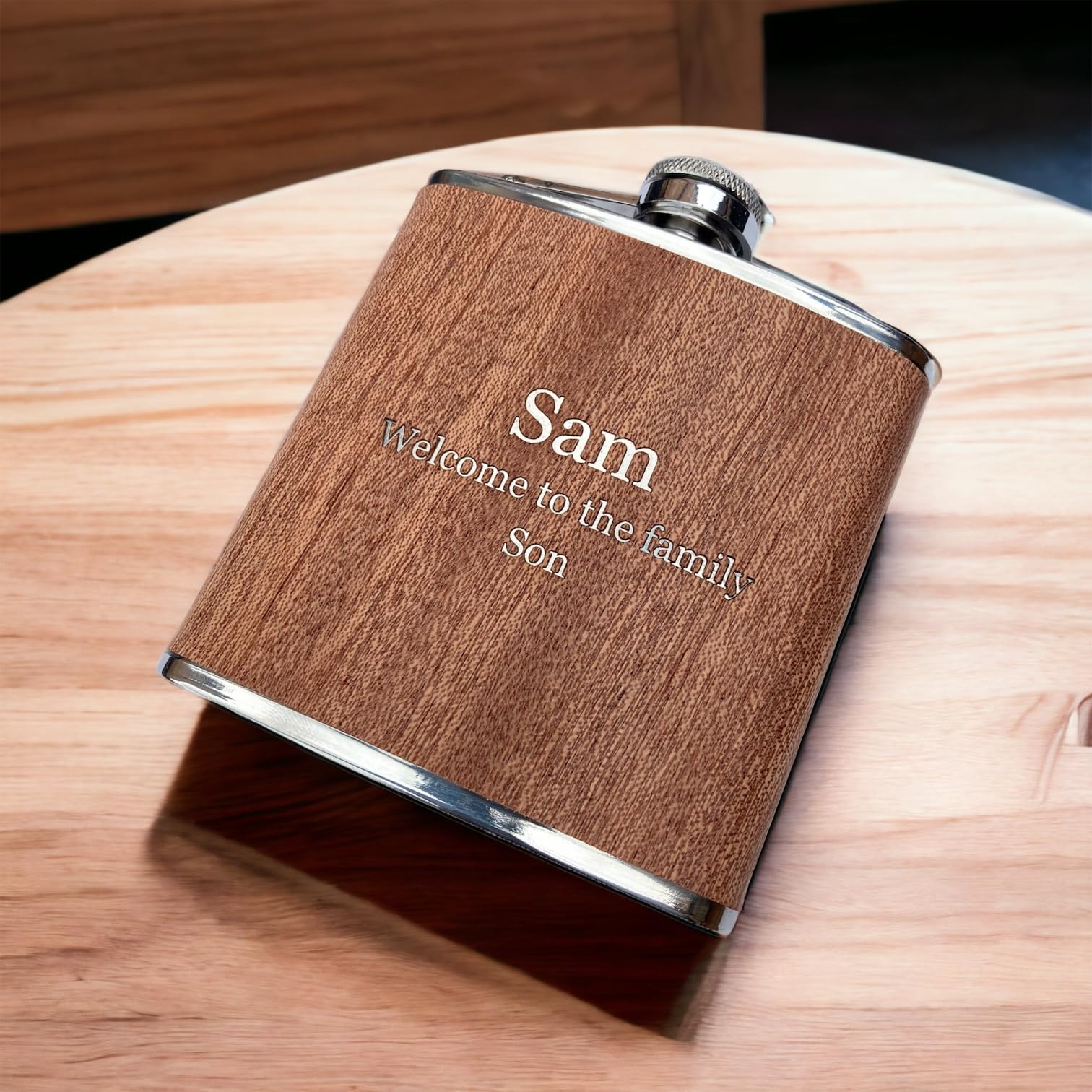 - Personalised Rutherfords Gifts Wood Wrap 6oz Hip Flask | Engraved with Name and Message of Your Choosing -
