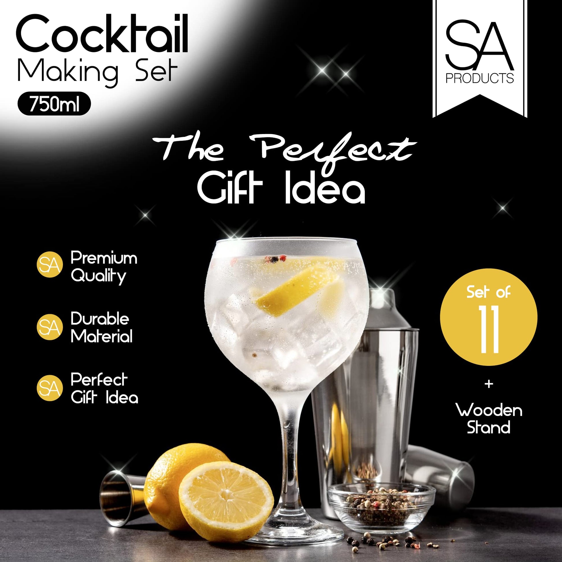 - SA Products 12 Piece Cocktail Shaker Set | Stainless Steel Cocktail Accessories | Bartender Kit with Drink Shaker, Jigger, Spoon, Strainer, Corkscrew, Ice Tongs, Pestle, Pourers, Bamboo Display Stand -