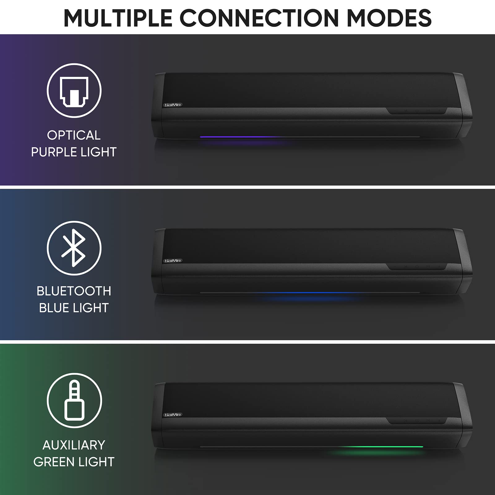 - Multiple Input Options: Supports Bluetooth for wireless music streaming and AUX and optical inputs for more wired connections, with different LED colors for each mode (Purple for Optical, Blue for Bluetooth, Green for AUX).