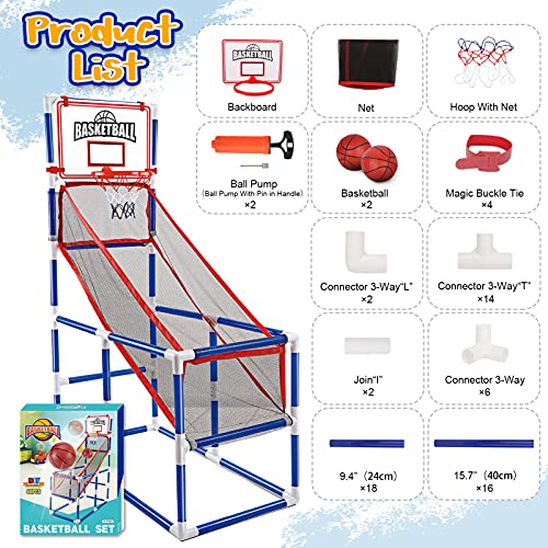 - Complete Arcade Basketball Set: Includes a backboard, net, two basketballs, pump, hoop with net, and 62 other accessories to assemble the set.