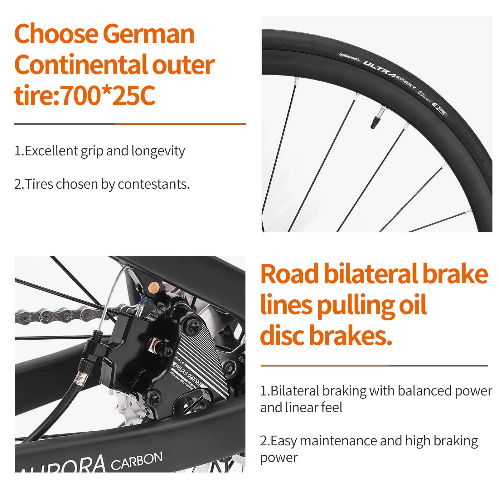 - Bilateral Disc Brakes: The road bike features road bilateral braking lines and oil disc brakes, providing balanced power, smooth braking, and excellent stopping force, making it ideal for both beginners and experienced riders.