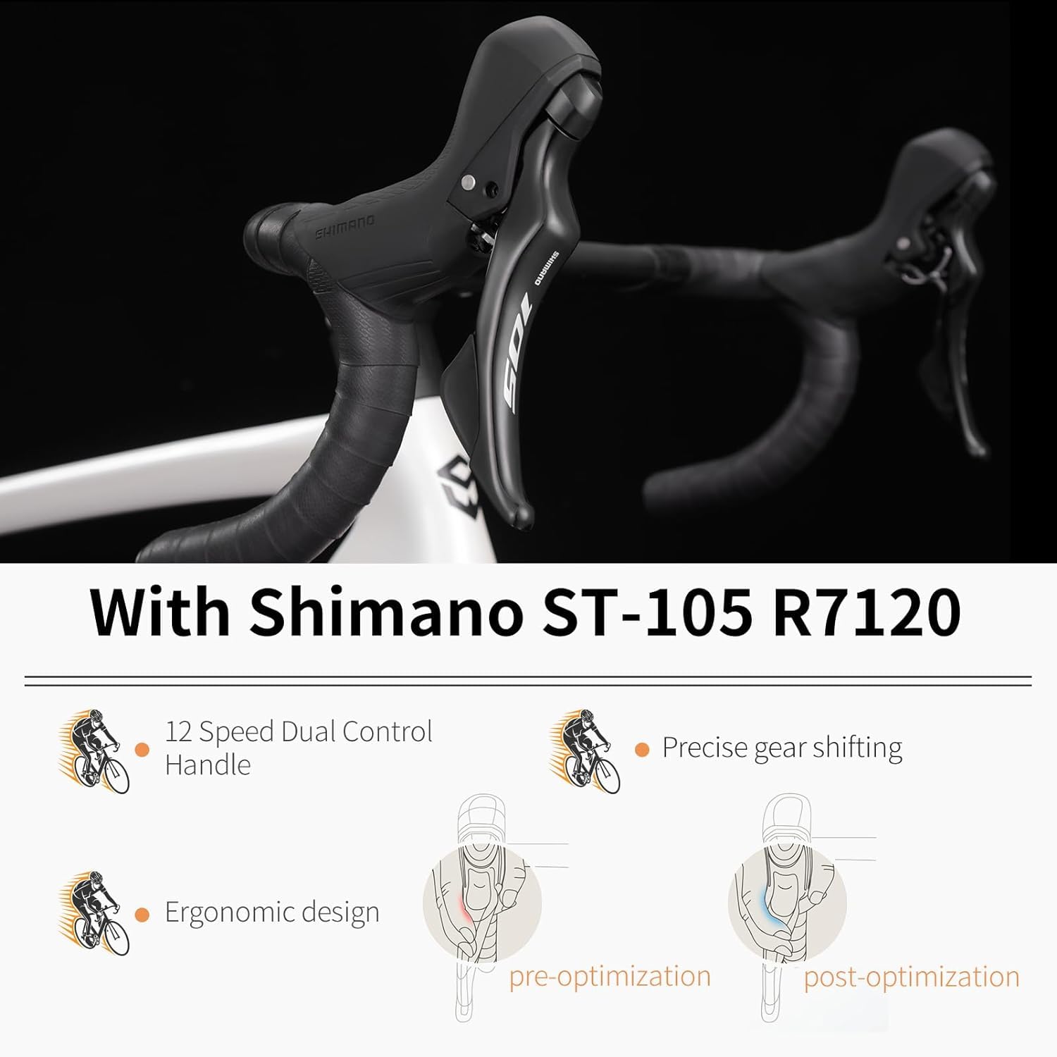 - R7120 Precision Shift Groupset: Equipped with the R7120 2x12-speed precision shifting system, including R7100 front and rear derailleurs, shifter lever, crankset, and flywheel. Enjoy smooth shifting and effective power transfer, perfect for race cyclists who need fast and reliable performance.