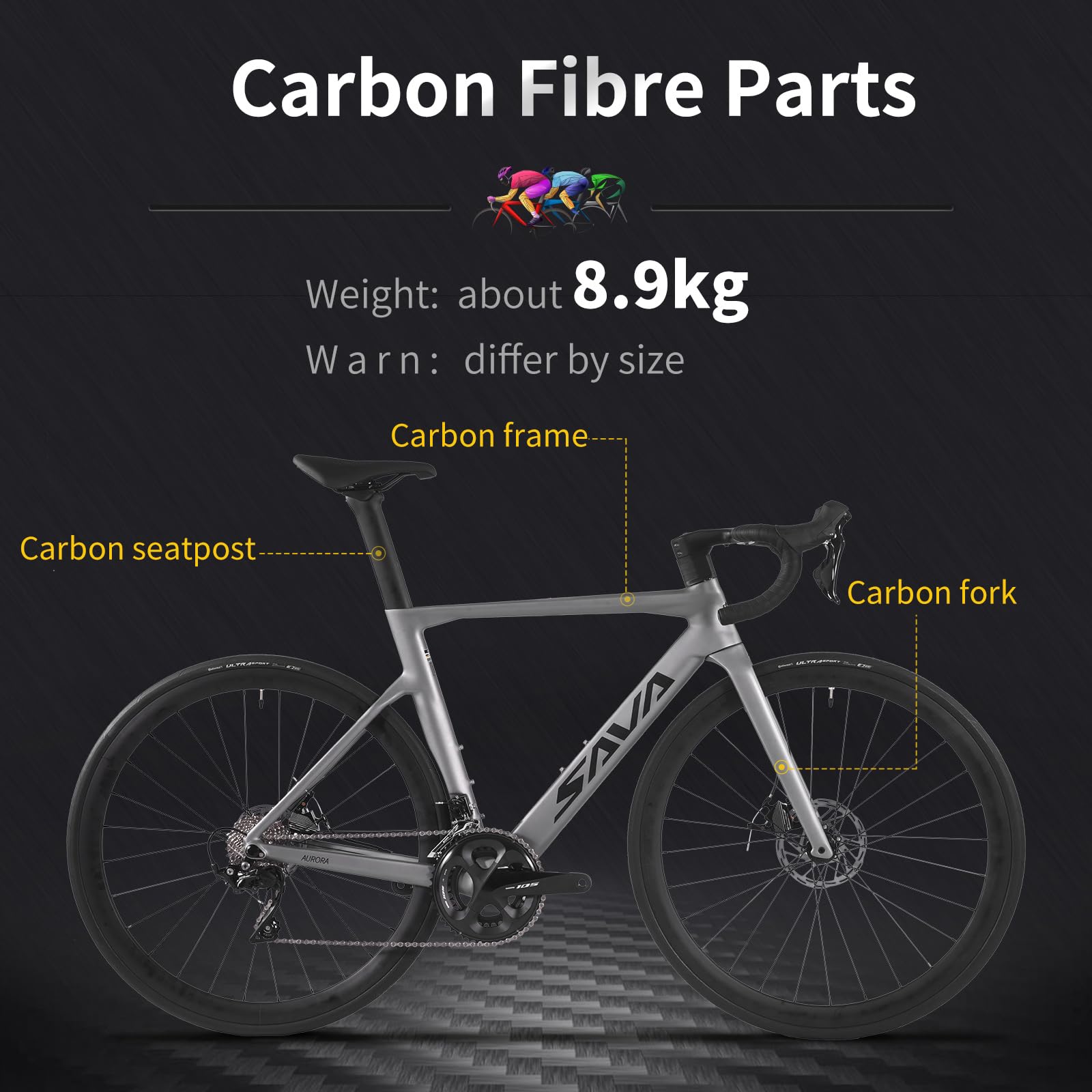 - Lightweight T800 Carbon Frame: The carbon fiber frame reduces weight to just 8.9kg (19.6lb), offering a perfect balance of stiffness and comfort. The carbon fork and seatpost add extra vibration dampening for a smoother ride.