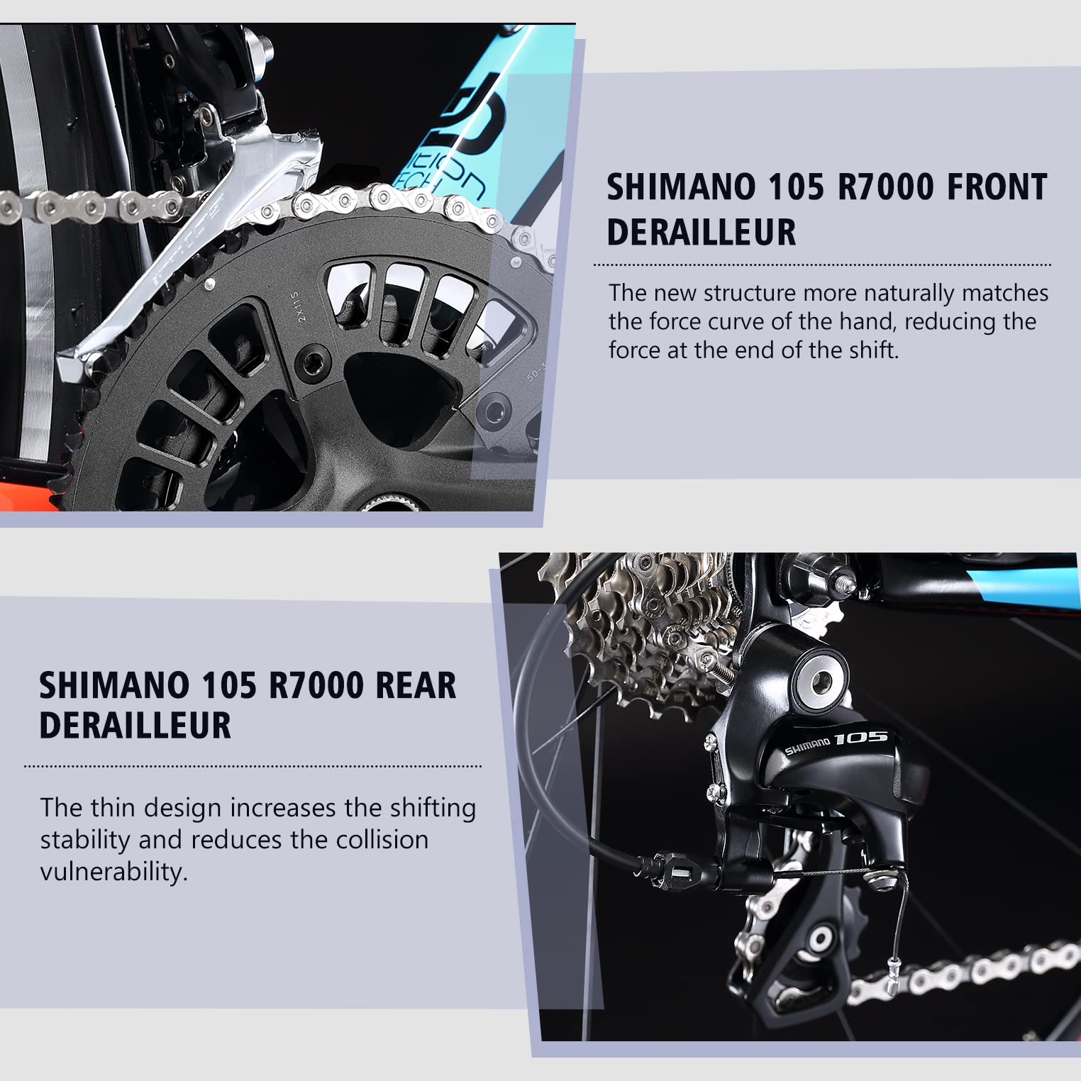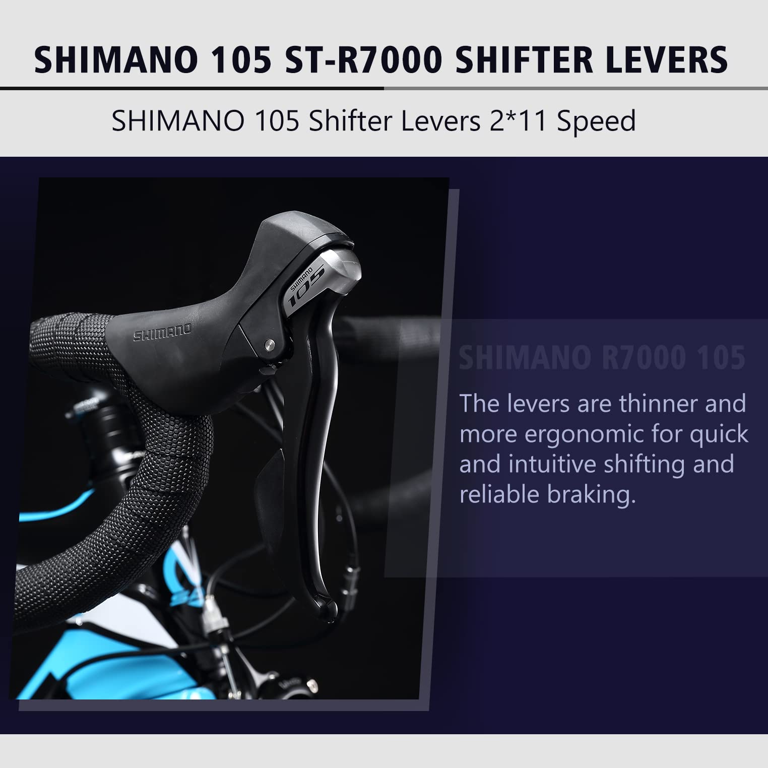 - SHIMANO 105 7000 2x11-Speed Drivetrain: Featuring SHIMANO 105 components, including the shifter lever, front derailleur, and rear derailleur, this bike offers fast and precise shifting. Whether you're accelerating or shifting between gears, enjoy a smooth and responsive ride.