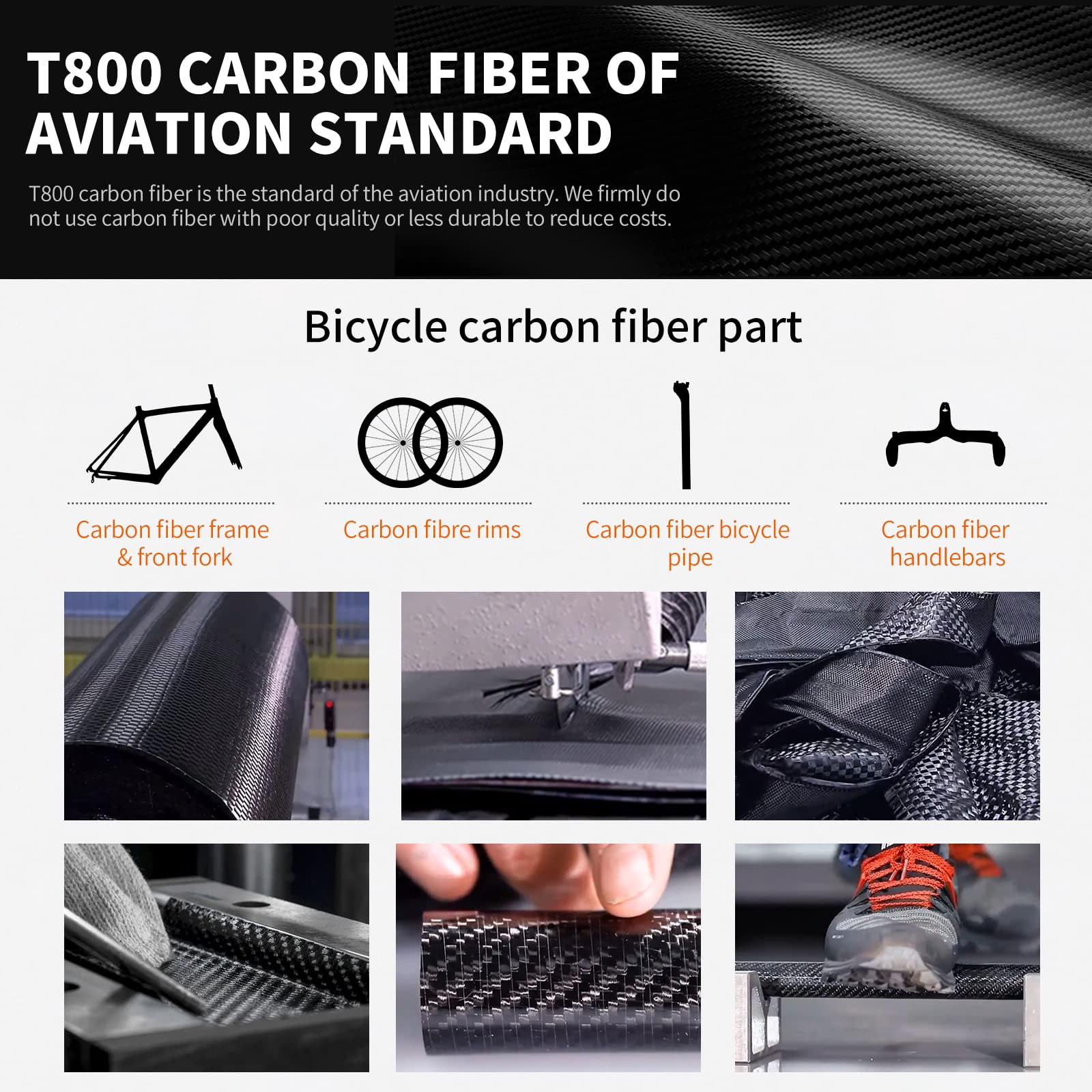 - T800 Carbon Fiber Construction: The frame, wheelset, fork, handlebar, headset, and seat post are made with high-quality Japanese T800 carbon fiber, offering an ultra-light design (8.3 kg / 18.86 lb) that enhances power efficiency and damping for smoother rides.