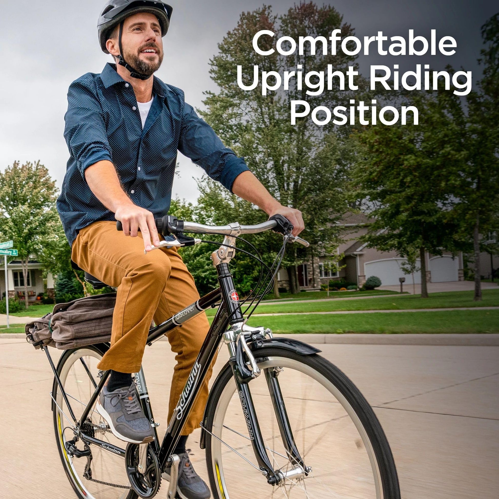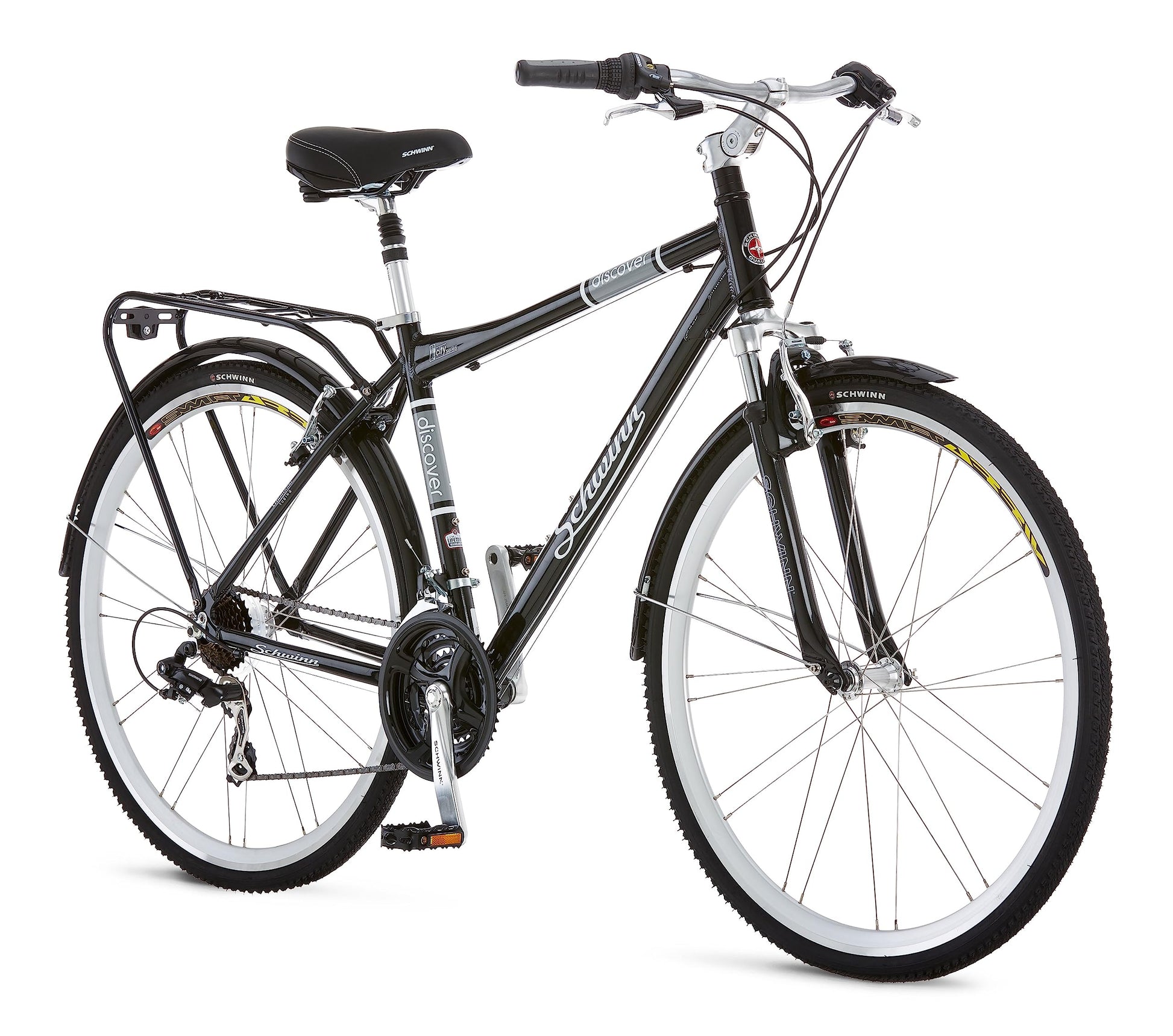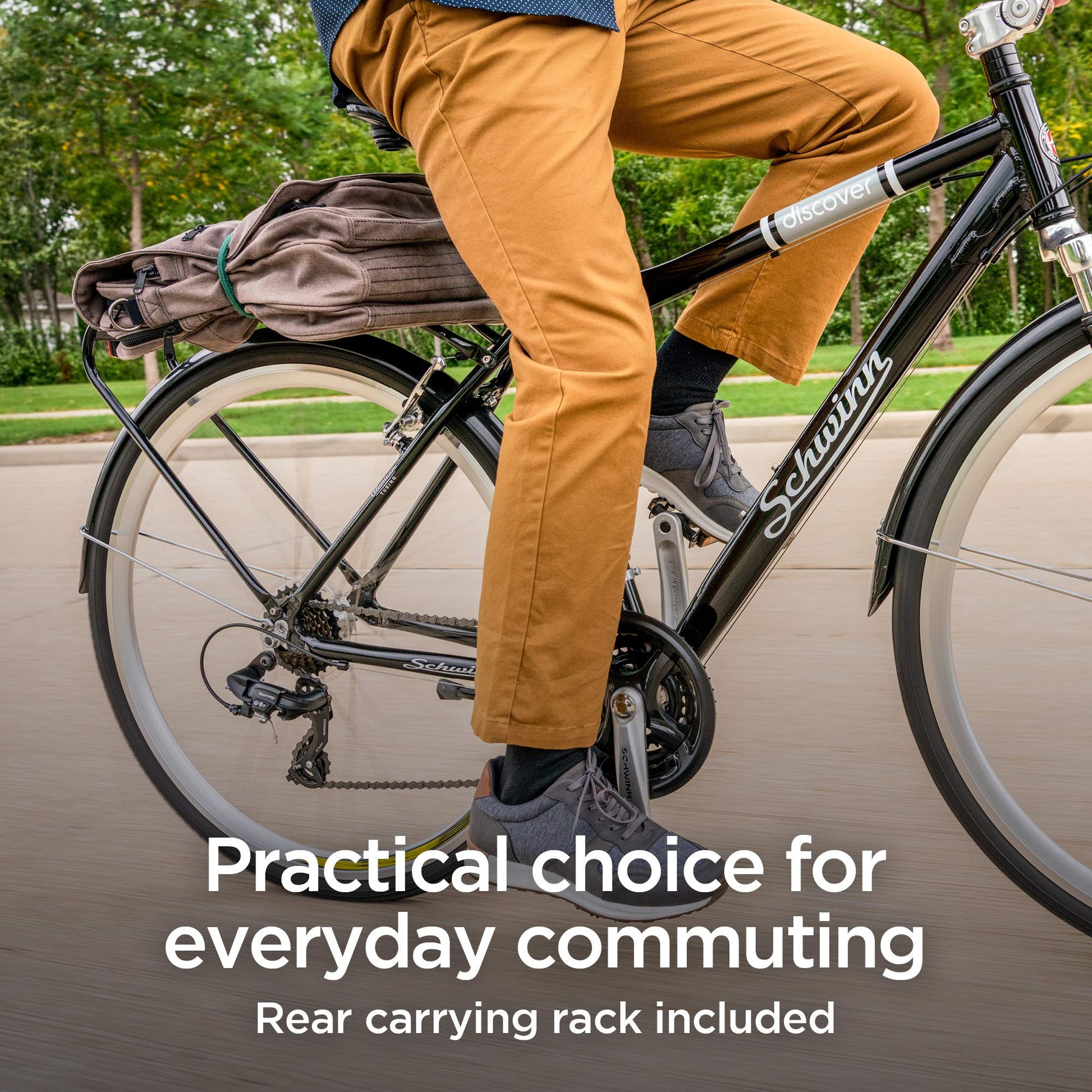 - Schwinn Discover Adult Hybrid Bike for Men and Women | 700c Wheels, 21-Speeds | 19-Inch Aluminum Step-Over Frame | Front and Rear Fenders | Rear Cargo Rack | Black -