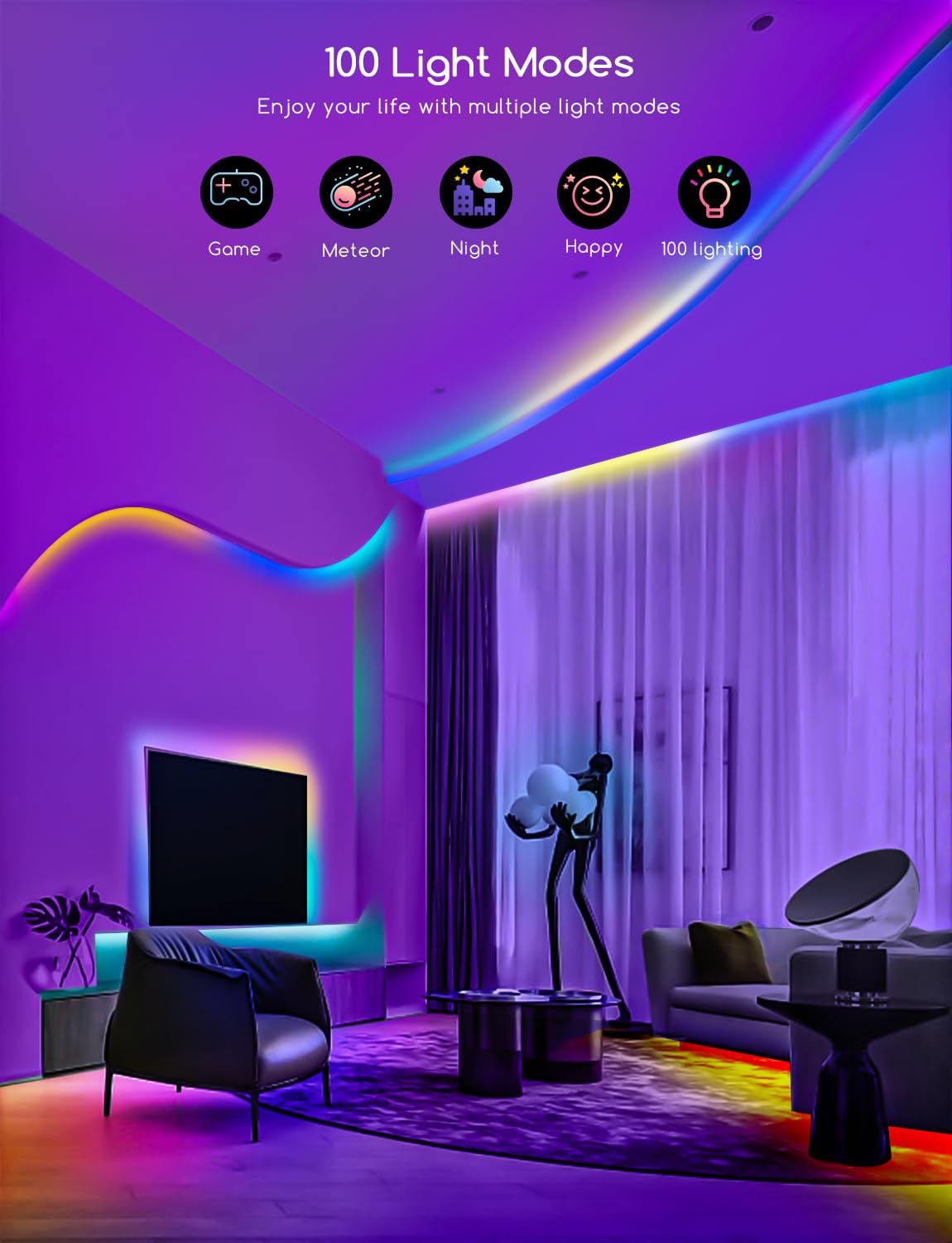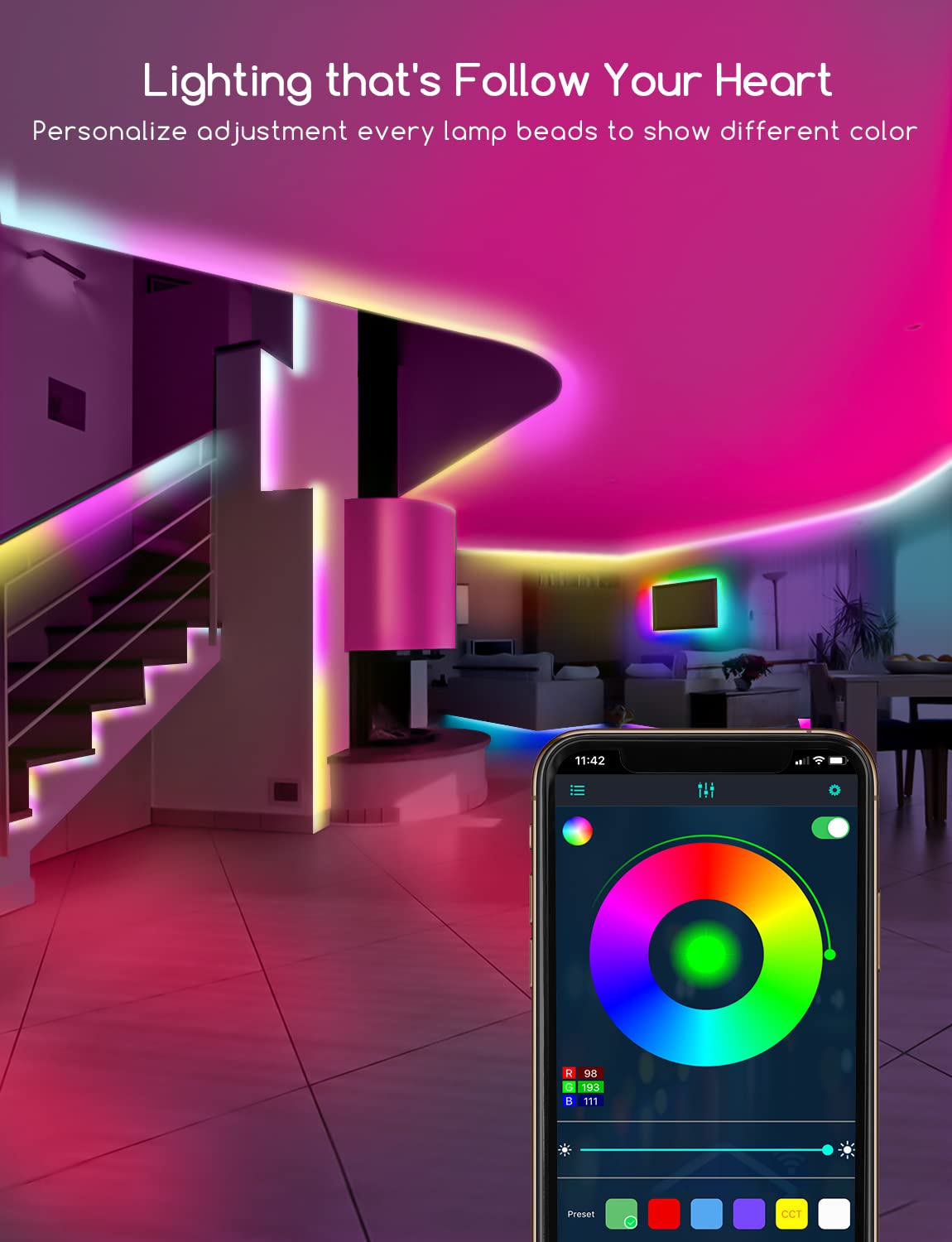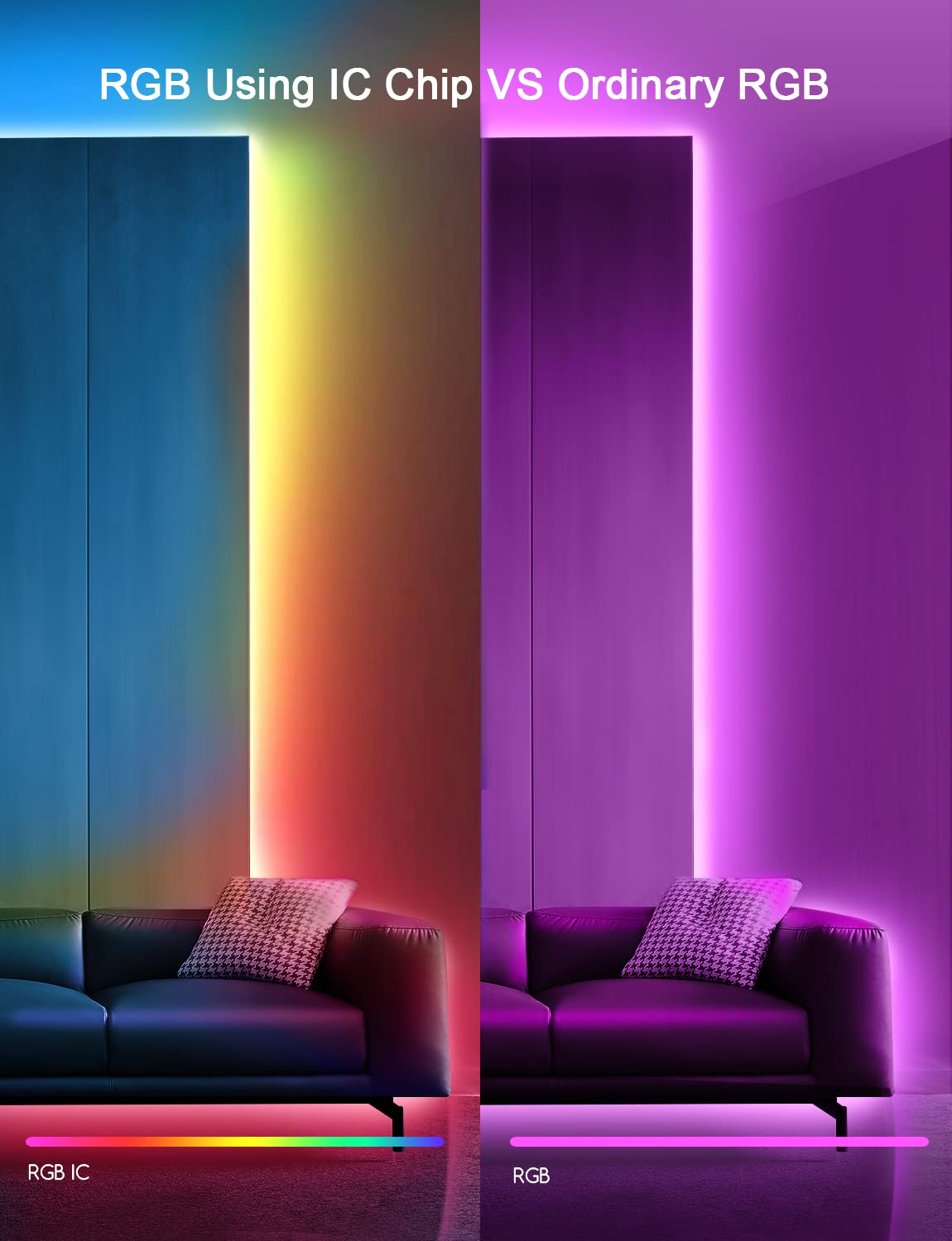 - Smart Rainbow Color Effects – Built-in IC chips allow segmented colors on the strip, creating eye-catching lighting effects.