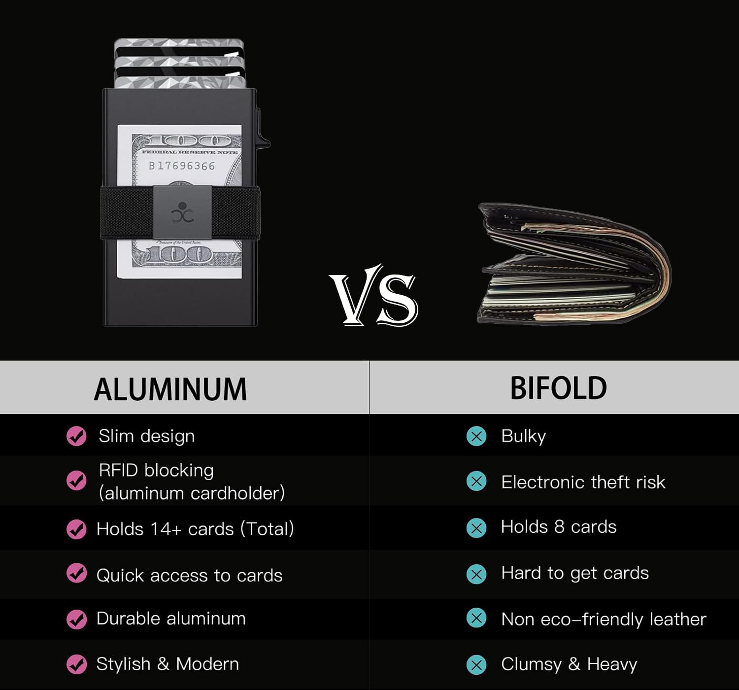 - Easy Access & Large Capacity: The wallet can hold up to 6 cards, which are easily accessed with the push of a button. The outer metal back panel can store an additional 6 cards, and the elastic band holds cash or receipts.