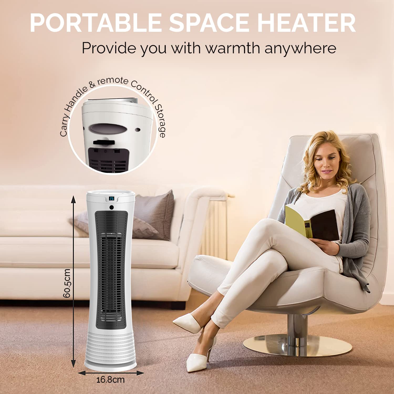 - Portable Design: The discreet handle makes it easy to move the heater from room to room.