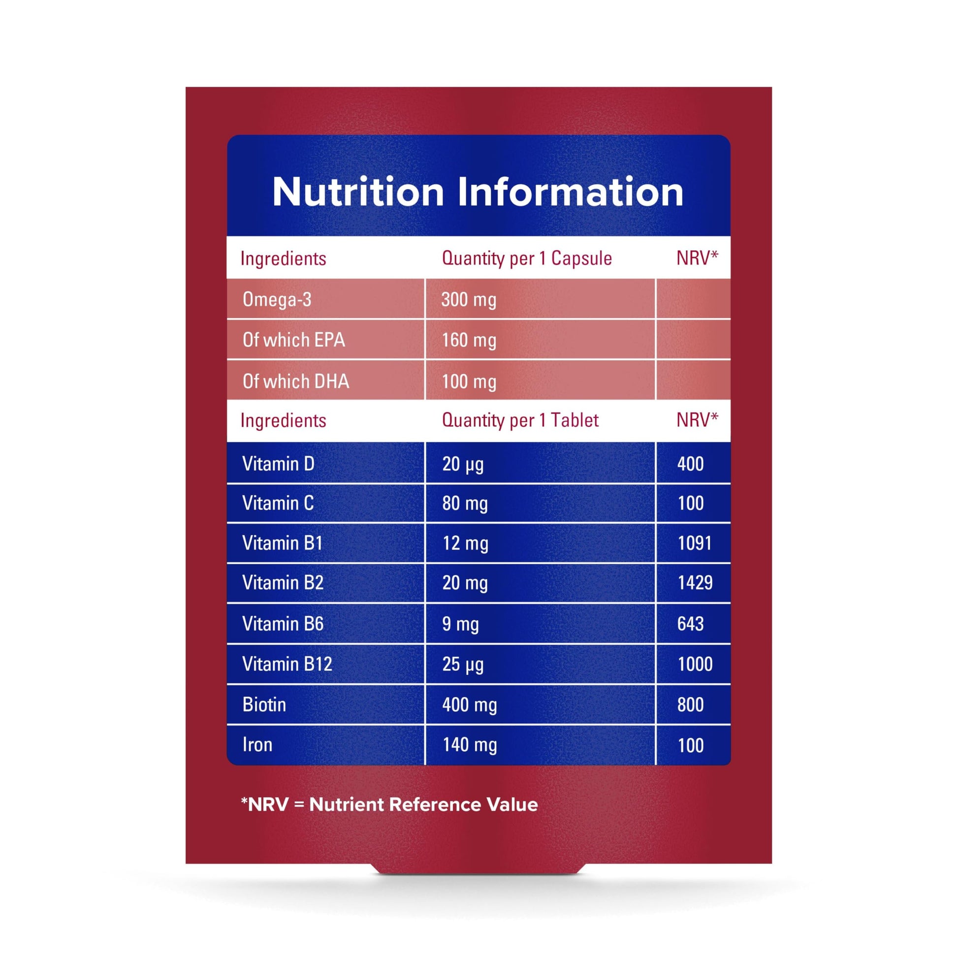 - Quantity: 30 Omega-3 capsules and 30 multivitamin tablets (30-day supply)