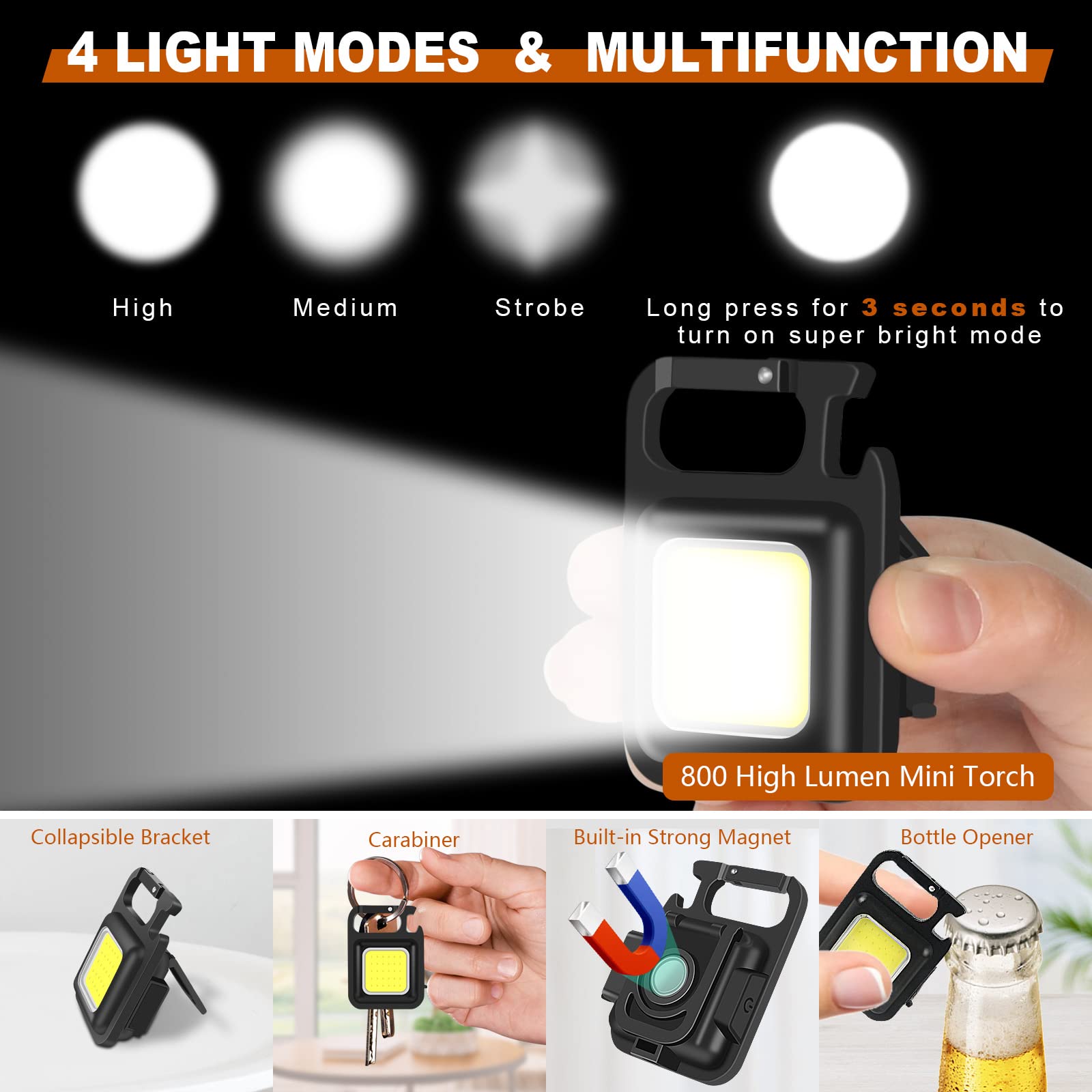 - COB Small Torch Included: A small, bright keychain flashlight (800 lumens) is included. This light features a magnetic back for easy attachment to metal surfaces and a foldable handle for hands-free use.
