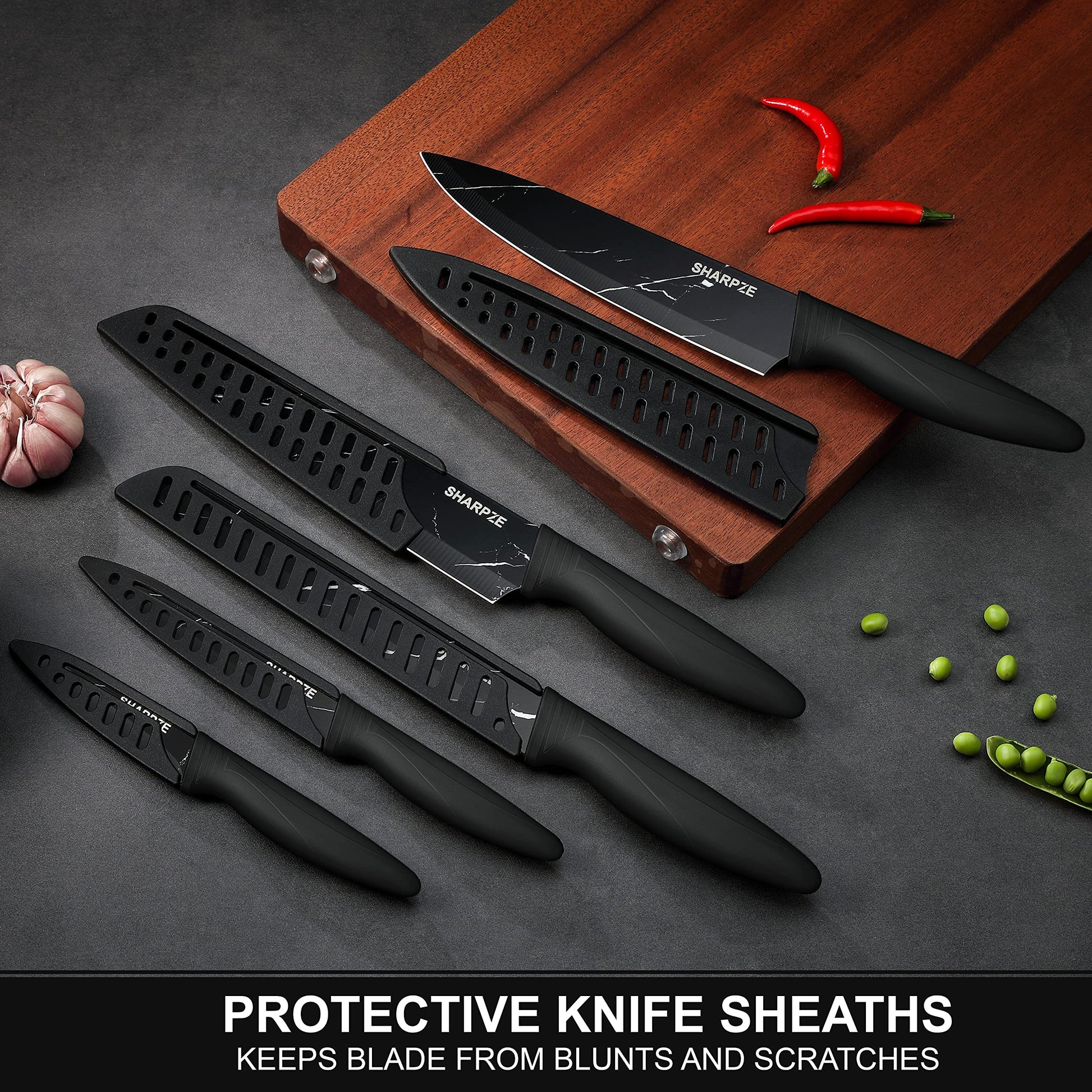 - Complete Knife Set with Protective Sheaths: Includes a chef’s knife, bread knife, slicing knife, utility knife, and paring knife, along with protective sheaths for each blade to ensure safety and longevity.