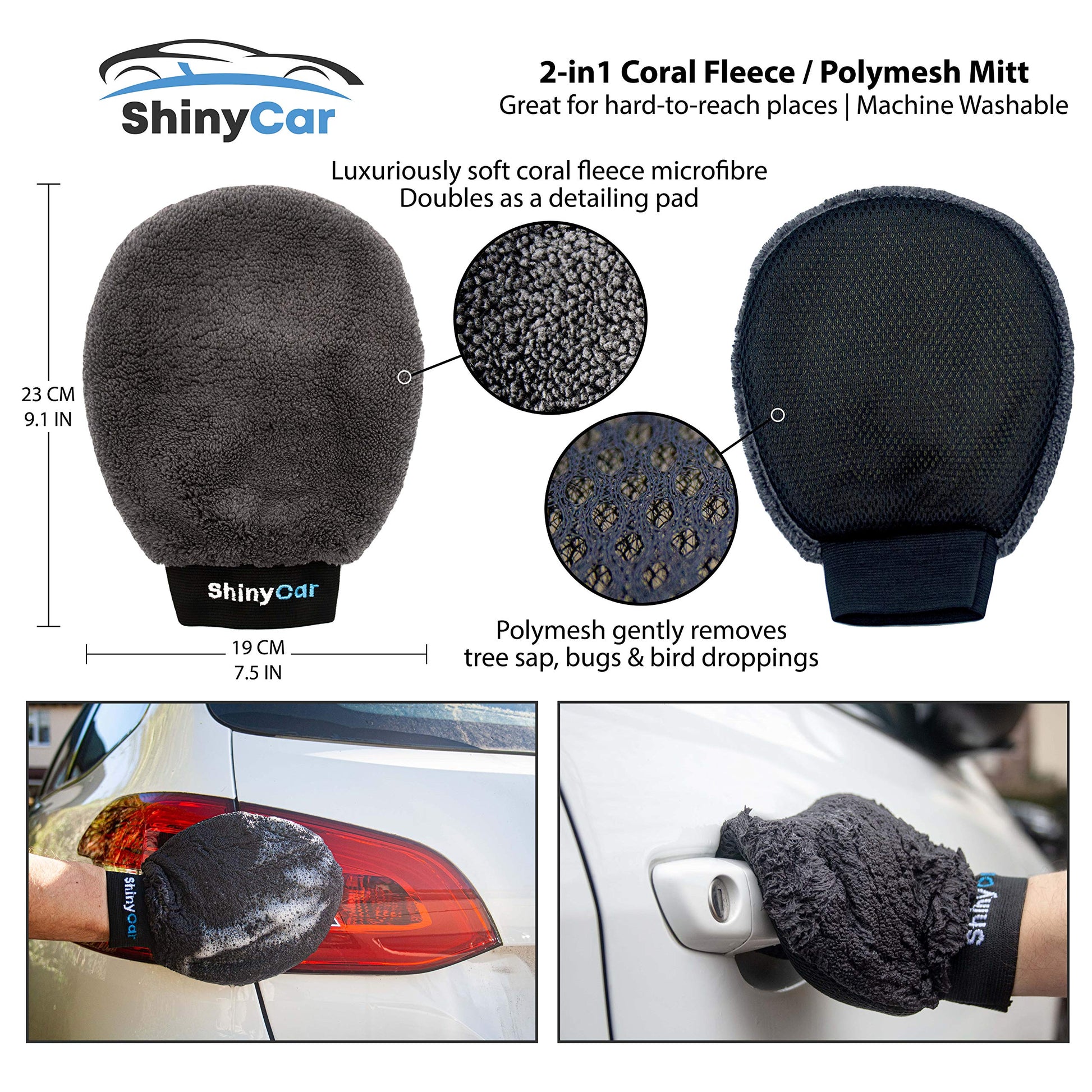 - Chenille Wash Mitt & 2-in-1 Coral Fleece/Bug Removing Polymesh Mitt: Soft, plush mitts fit comfortably, with a polymesh side for removing tree sap, insects, and bird droppings, and a coral fleece side for polishing.