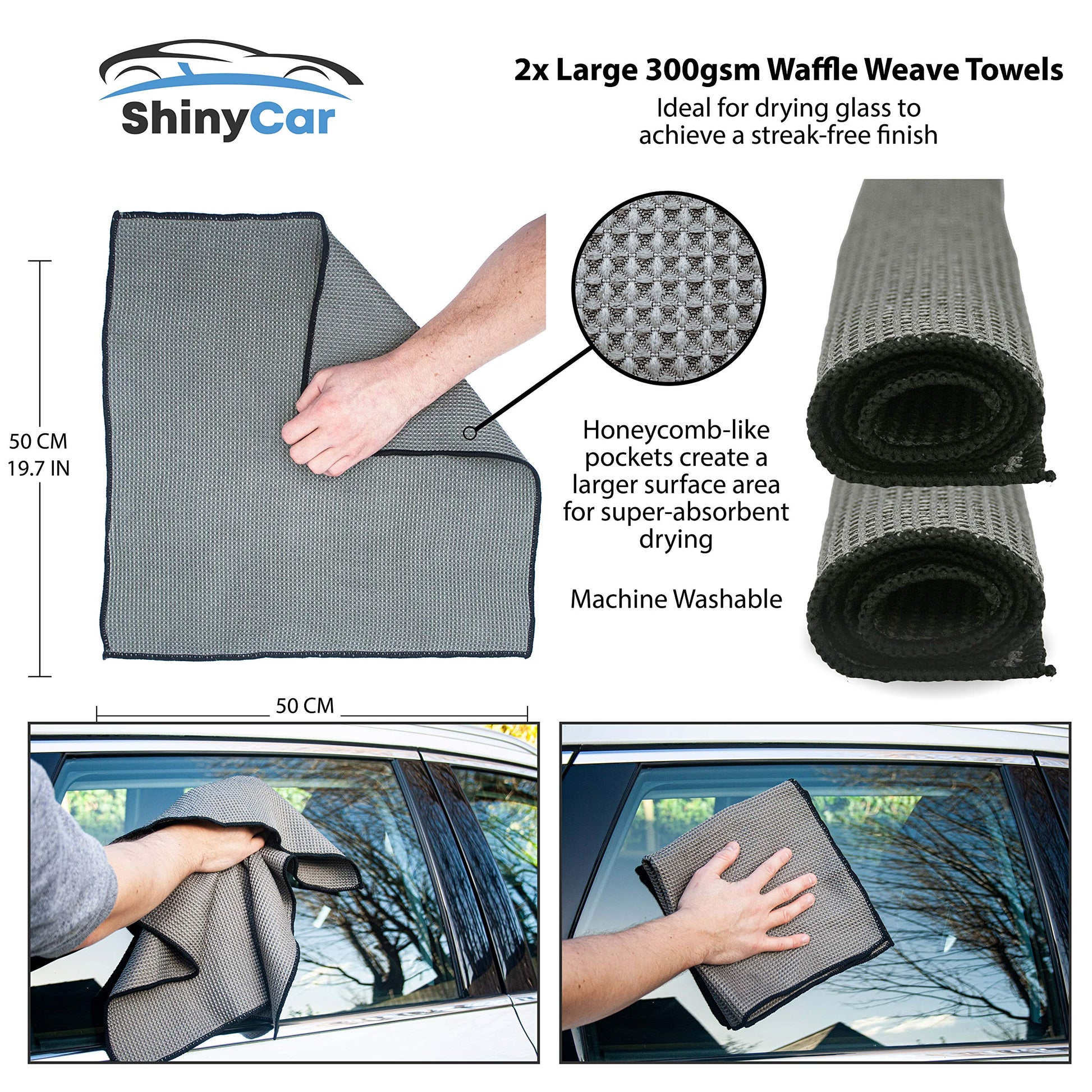 - 2 Large 300 GSM Microfiber Waffle Weave Towels: Perfect for drying or polishing glass, achieving a professional, streak-free shine.