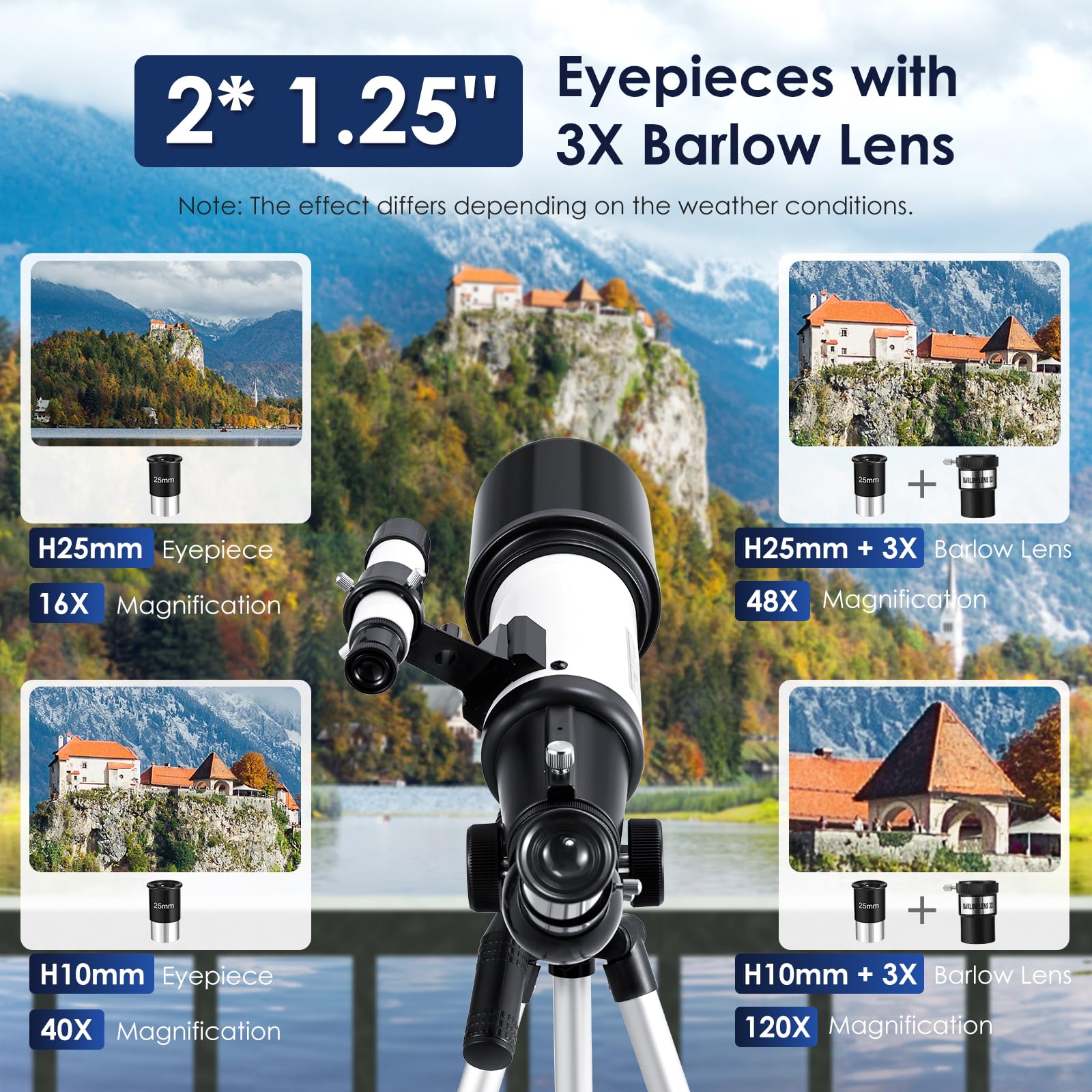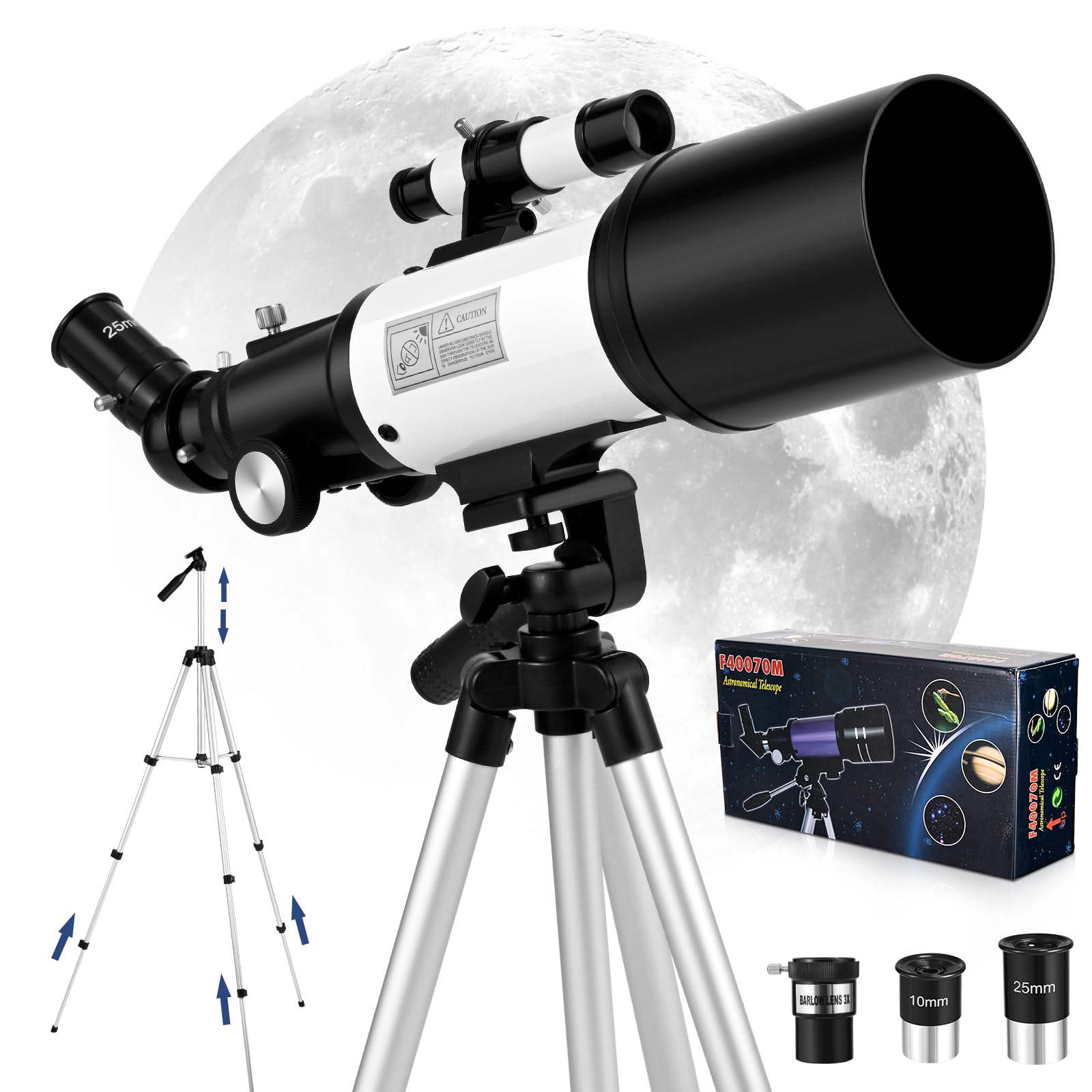 - High Magnification: Comes with two 1.25-inch eyepieces (H25mm for 16x magnification and H10mm for 40x magnification), plus a 3X Barlow lens to extend magnification up to 120x. Perfect for detailed views of planets and distant landscapes.