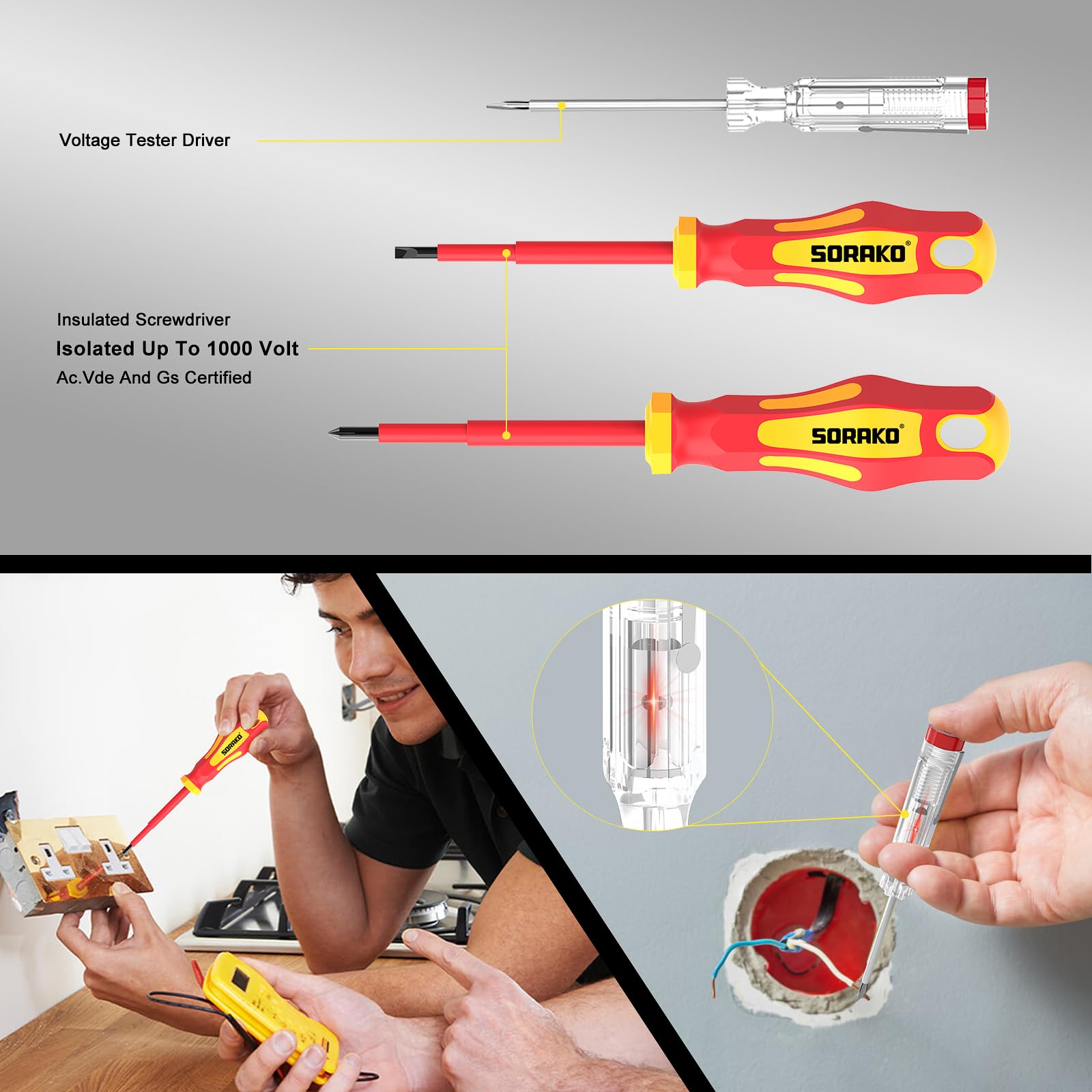 - Insulated screwdrivers and voltage tester provide safety for electrical work.
