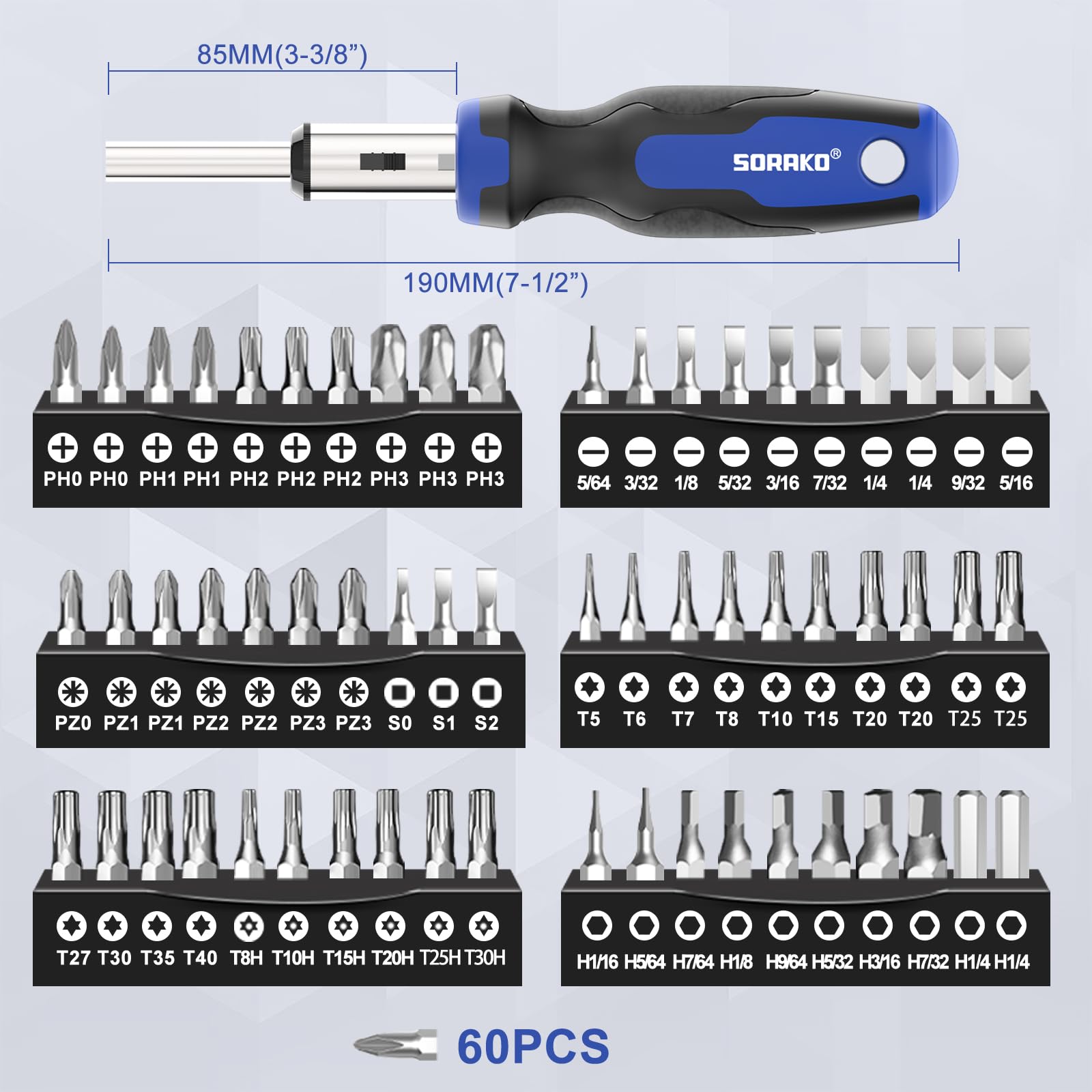 - 1/4" ratchet screwdriver with 60 bits covers different fastener types, including slotted, Phillips, and Torx.