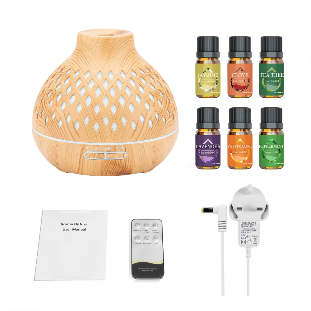 - Includes: 1 Essential Oil Diffuser, 1 Power Adapter, 1 Mini Remote Control, 6x10ml Essential Oils