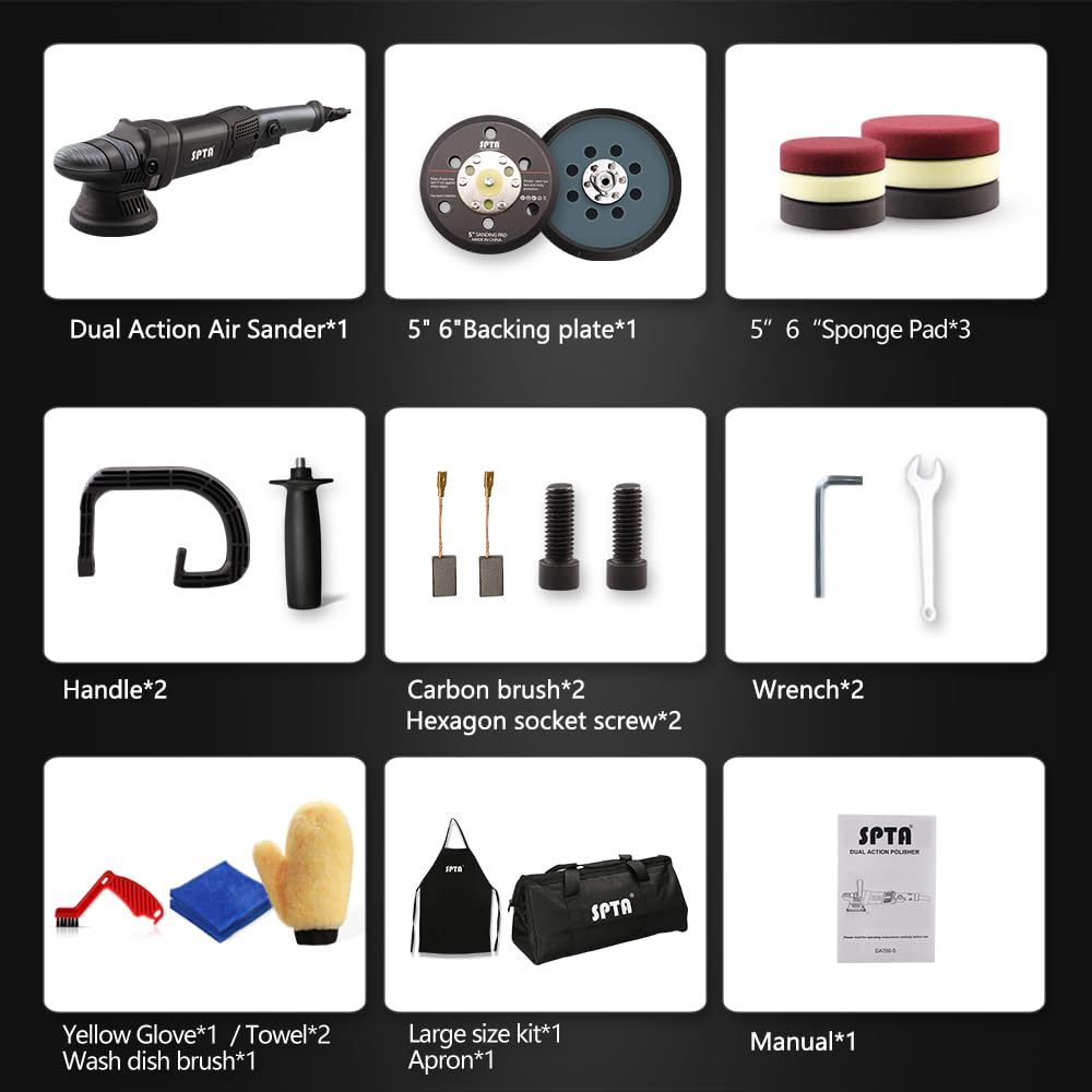 - Package Includes: 1x Coarse Compound (120ML), 1x Fine Compound (120ML), 1x Wash Dish Brush, 1x Large Size Kit, 1x Apron, 1x 5" Backing Plate, 1x Handle, 2x Carbon Brushes, 1x D-Type Handle, 2x Wrenches, 3x Sponge Pads (5"6"), 1x Wool Pad (5"6"), 12x Sanding Discs (5"), 12x Sanding Discs (6"), 1x Yellow Glove, 2x Towels, 1x Manual