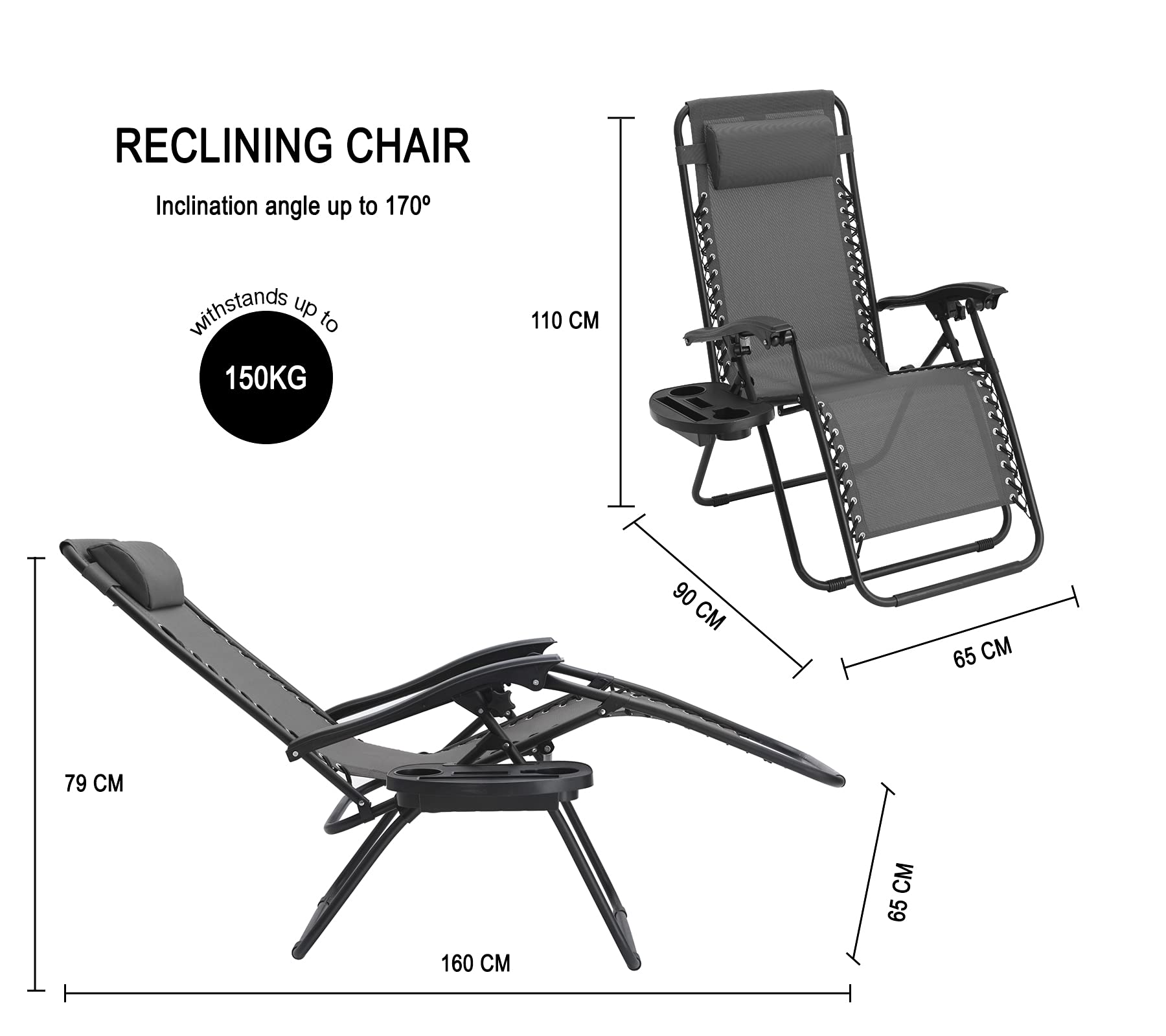 - Chair Dimensions: 110x90x65cm (upright), 79x160x65cm (reclining), 94x12x65cm (folded)