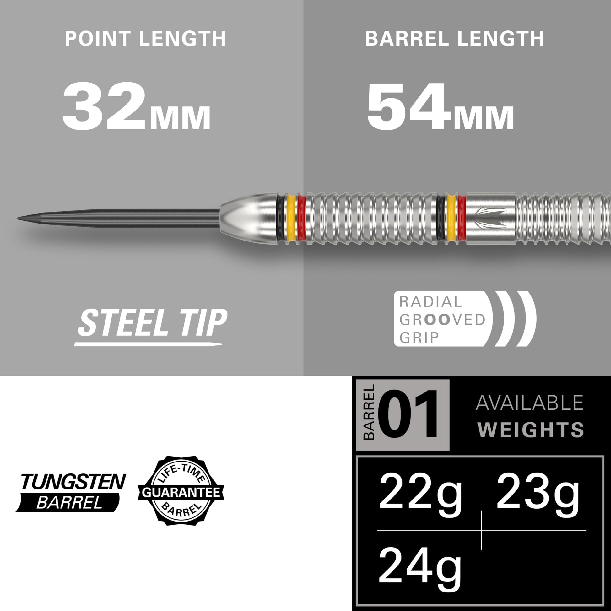 - Endorsed by Dimitri Van den Bergh: Designed in partnership with the PDC Champion, this dart set features radial grooved tungsten barrels for an exceptional grip and perfectly balanced throws. Barrel length is 54mm, with diameters of 6.5mm (22g), 6.65mm (23g), and 6.8mm (24g).