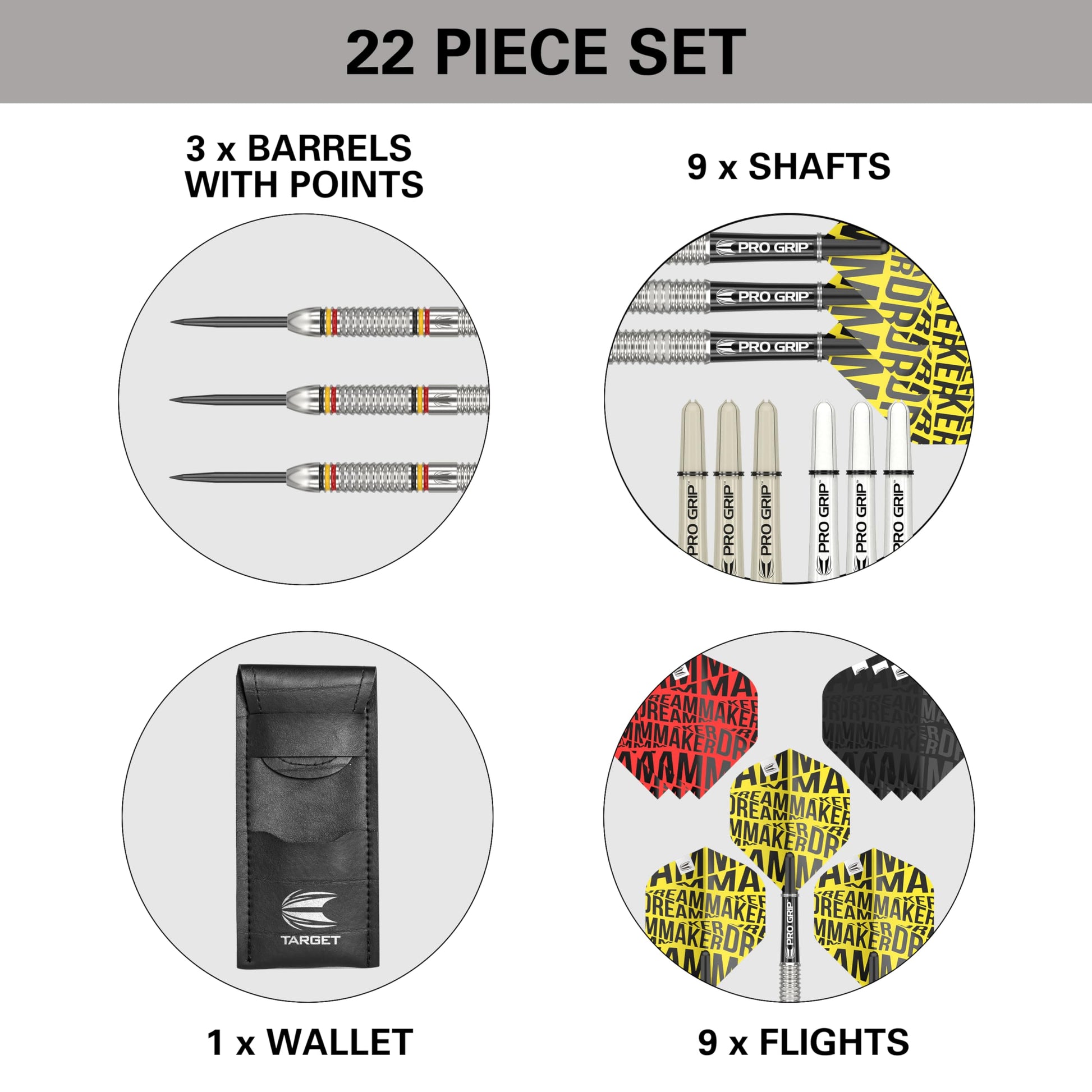 - Pro Grip Shafts & Pro.Ultra Flights: Includes 9 short Pro Grip shafts (34mm) and 9 No.2 Pro.Ultra flights with "The Dream Maker" branding in black, red, and yellow for personalized setup and stability.